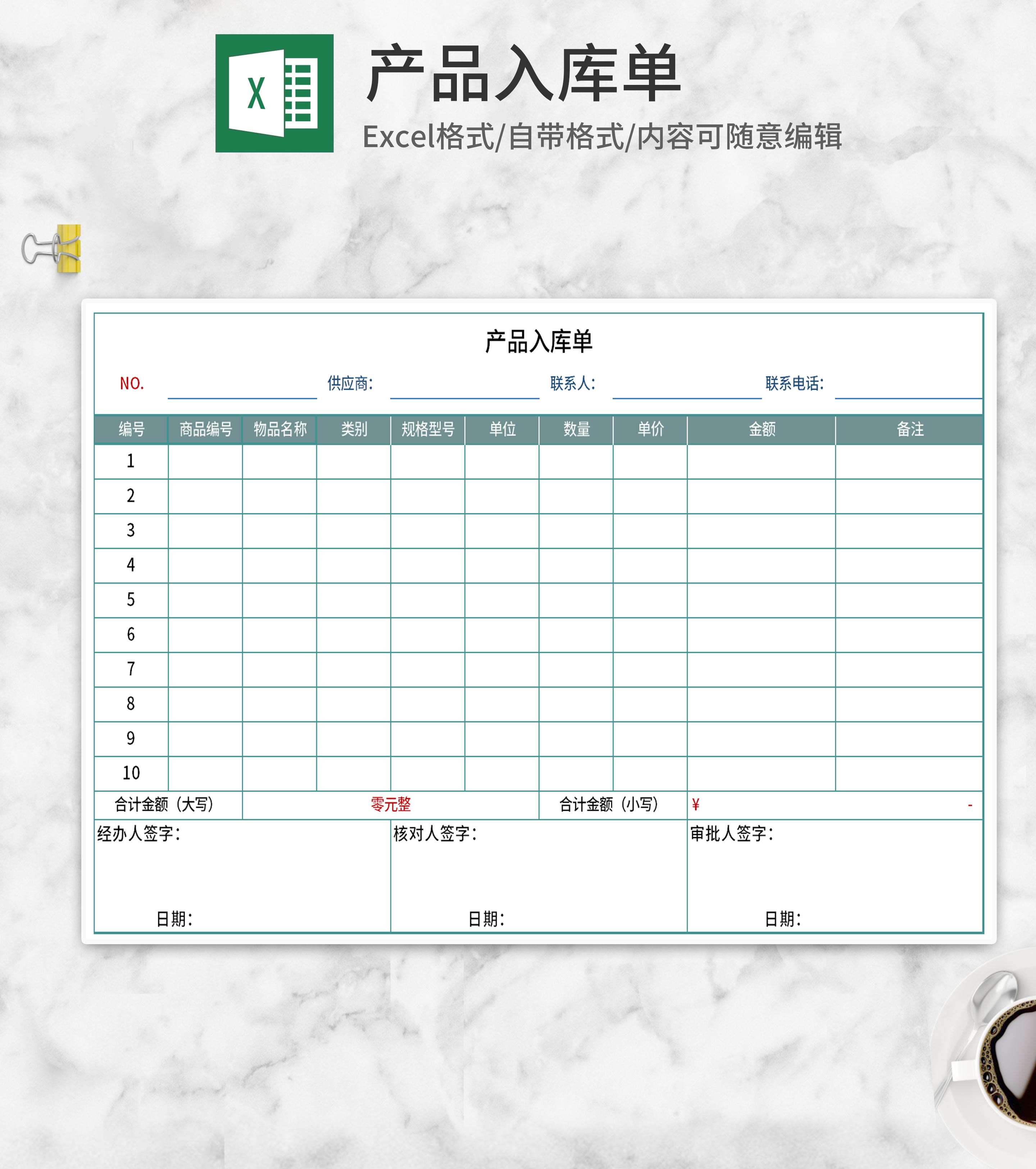 简约绿色产品入库单Excel模板