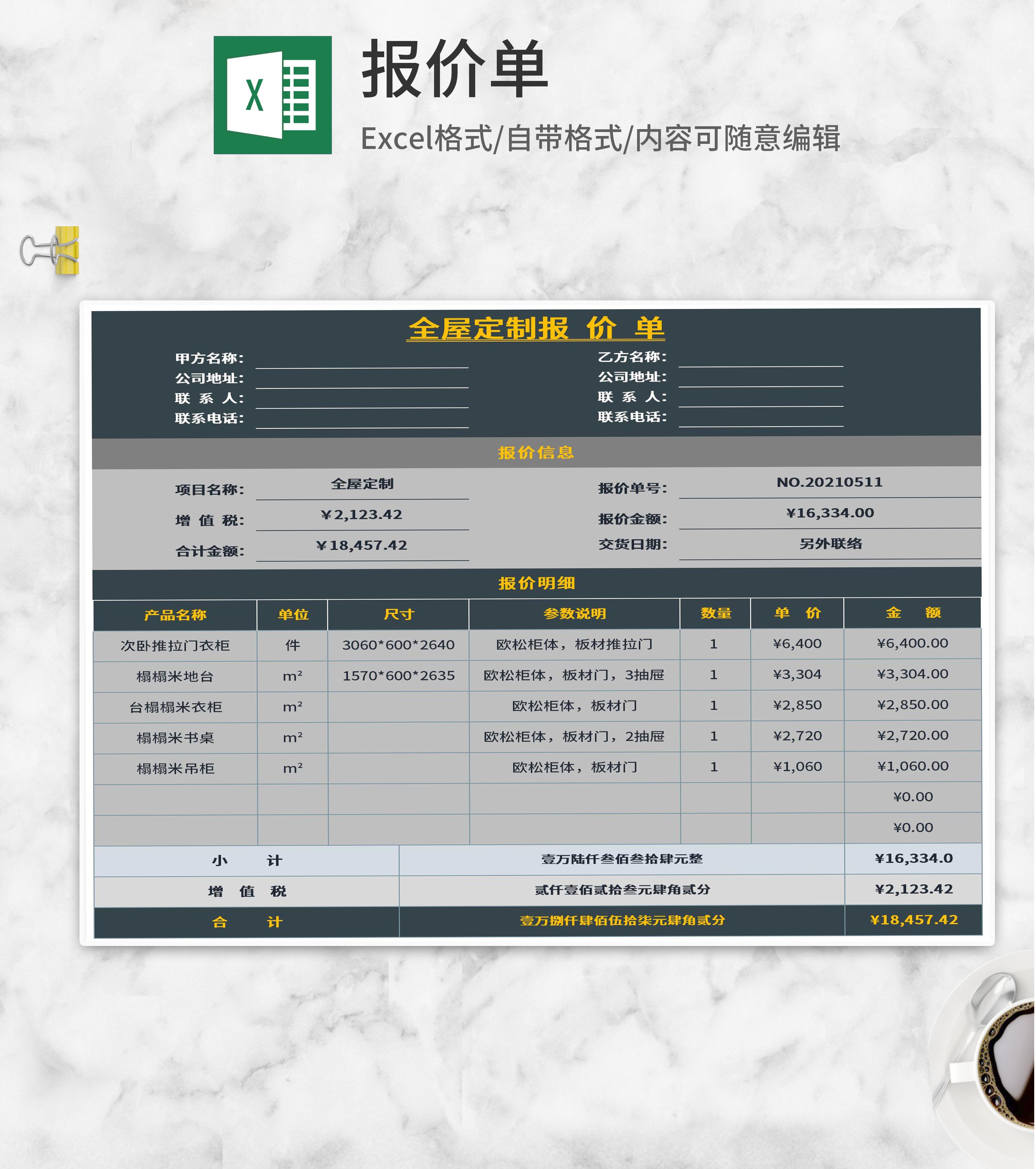 灰色全屋定制报价单Excel模板