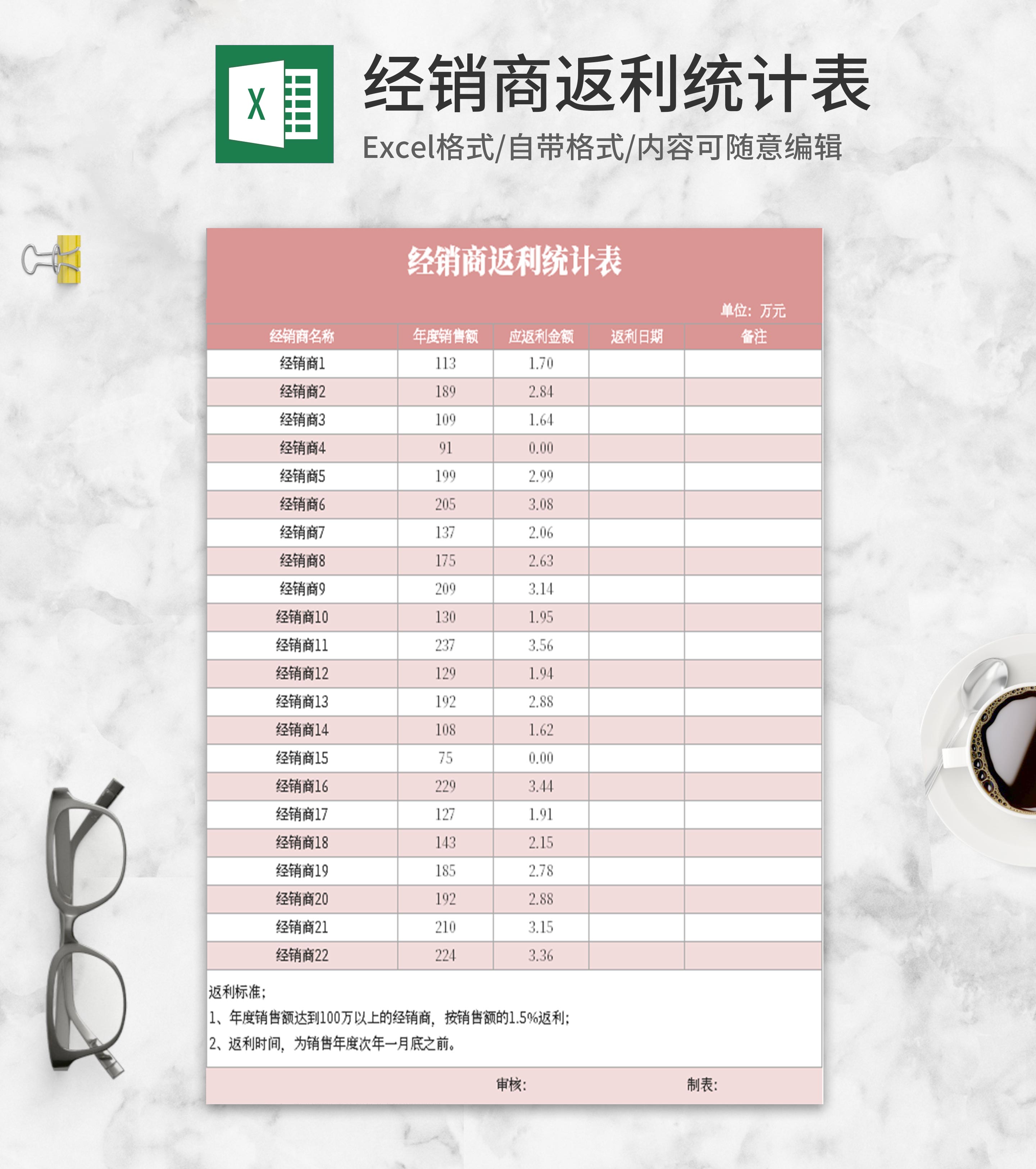 简约粉色经销商返利统计表Excel模板