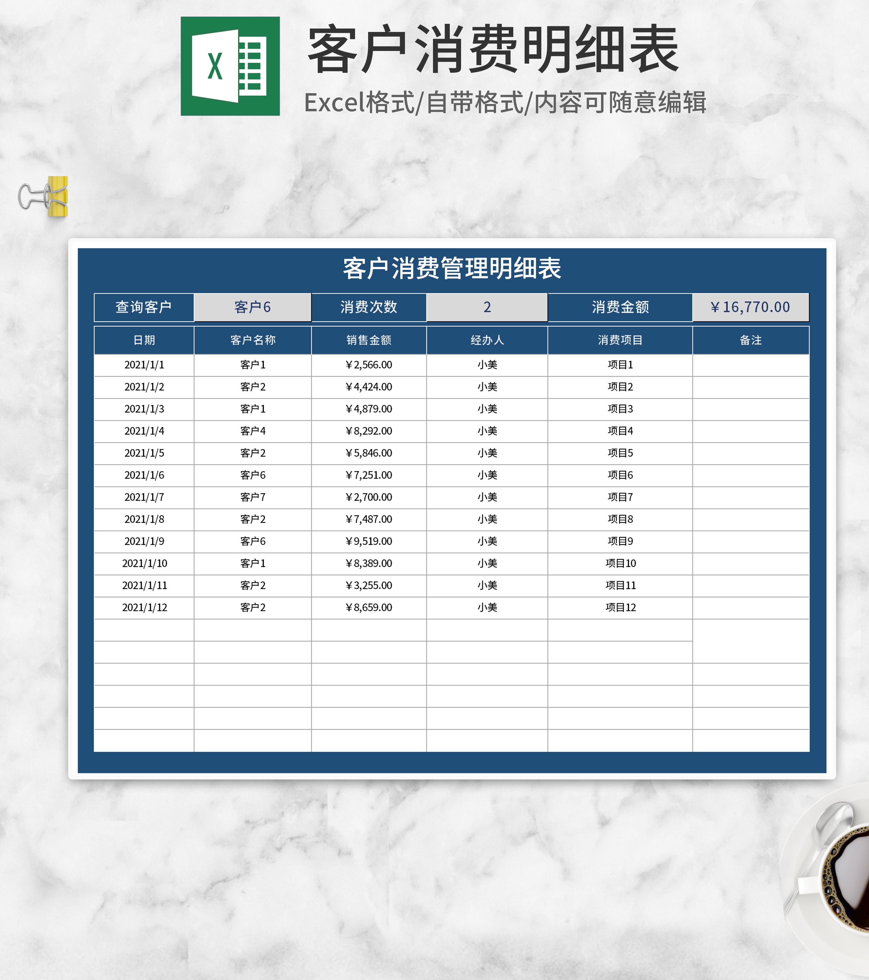 深蓝客户消费明细表Excel模板