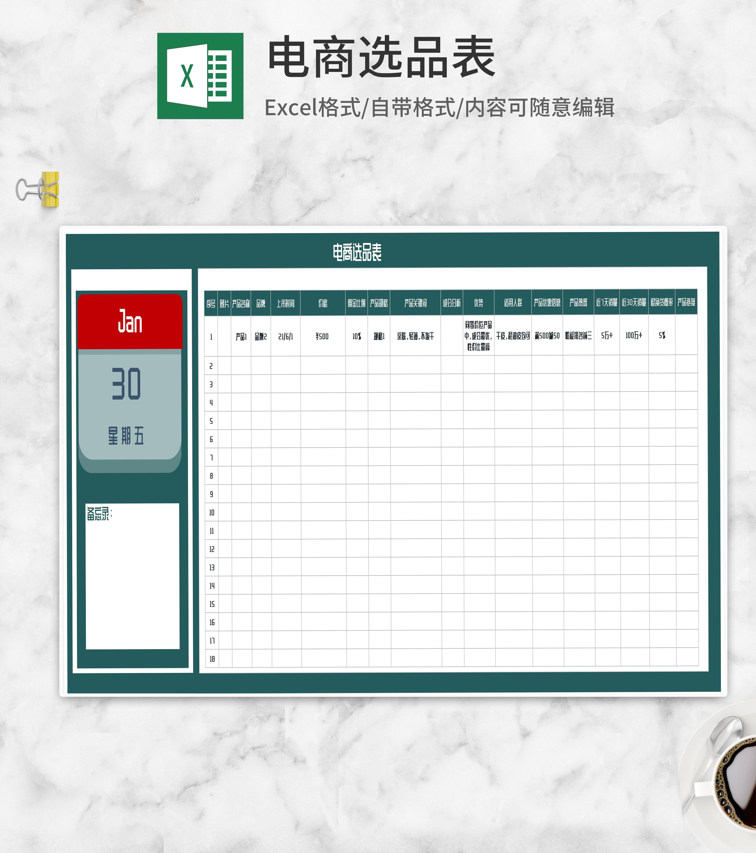 电商直播选品明细表Excel模板