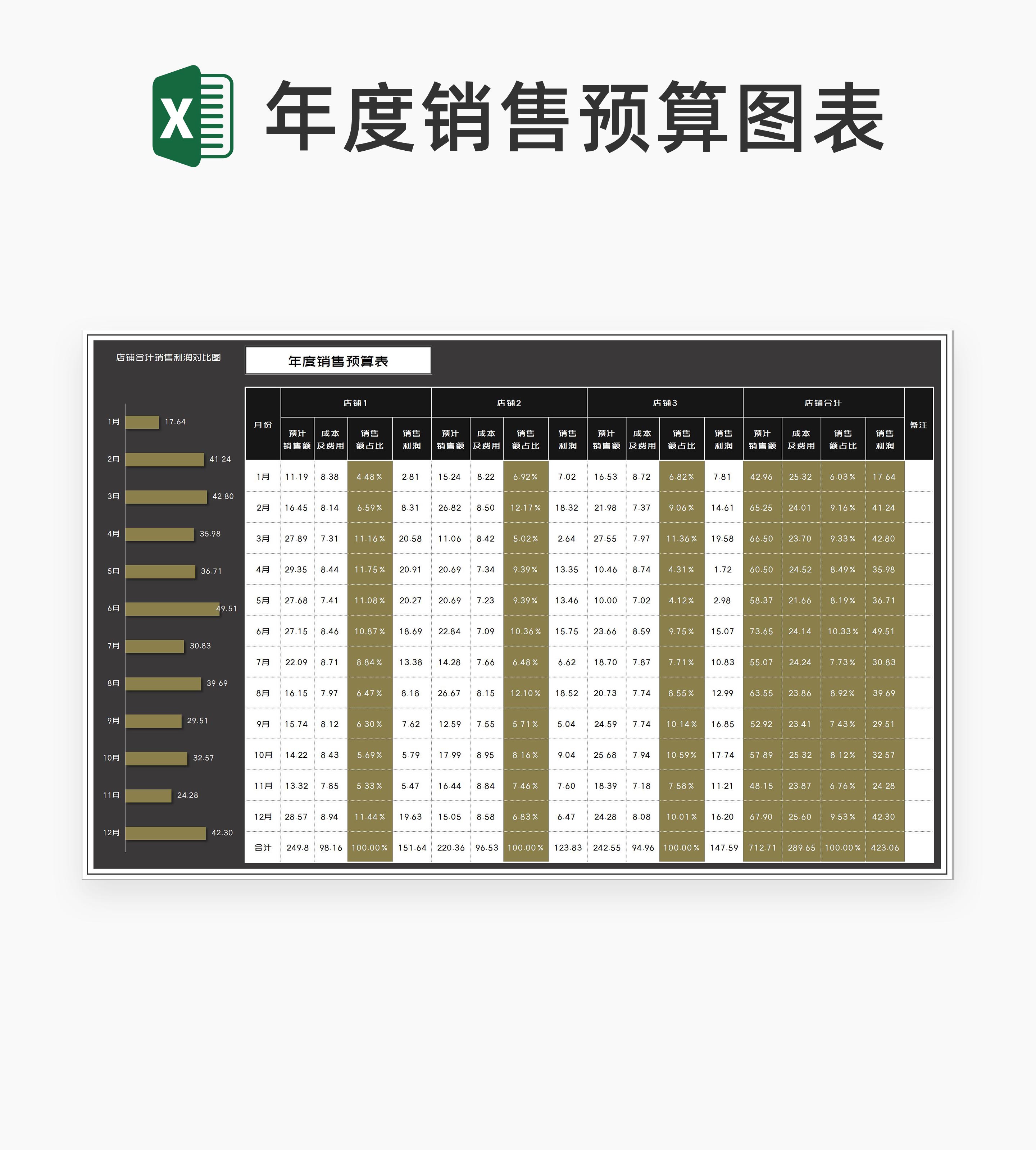 店铺合计年度销售利润预算表Excel模板