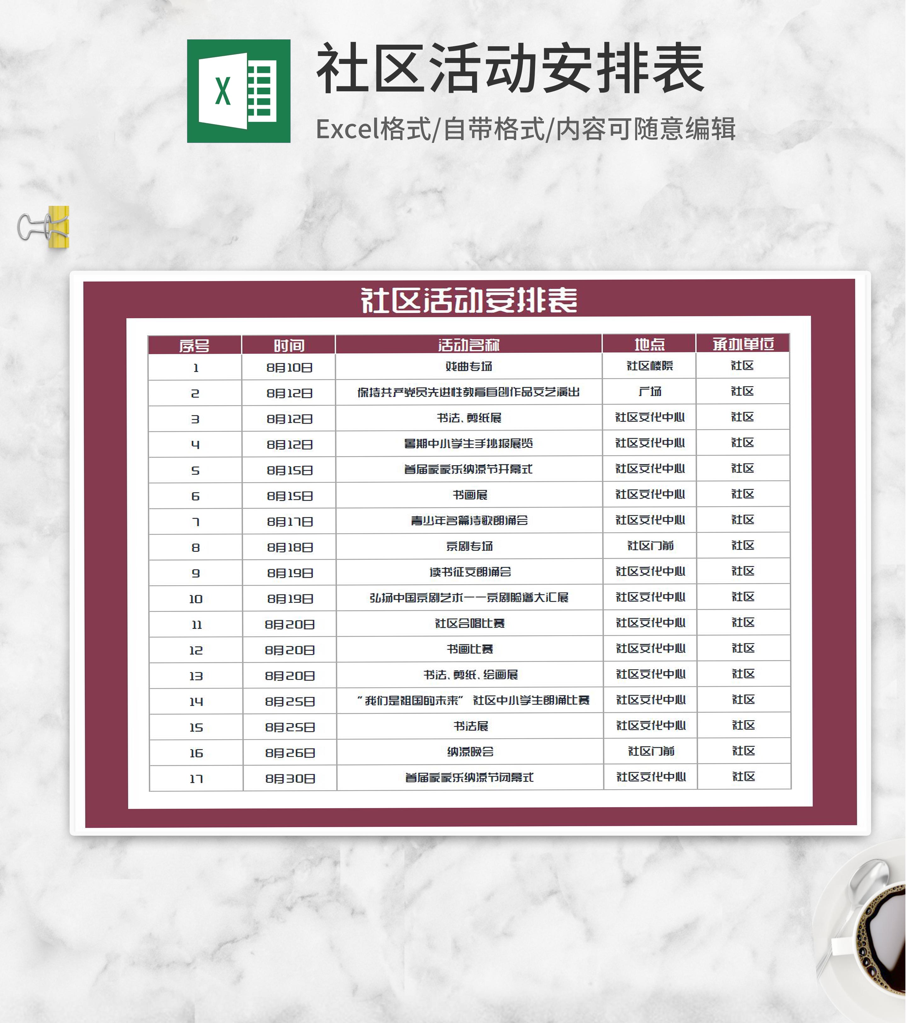 社区娱乐活动安排表Excel模板