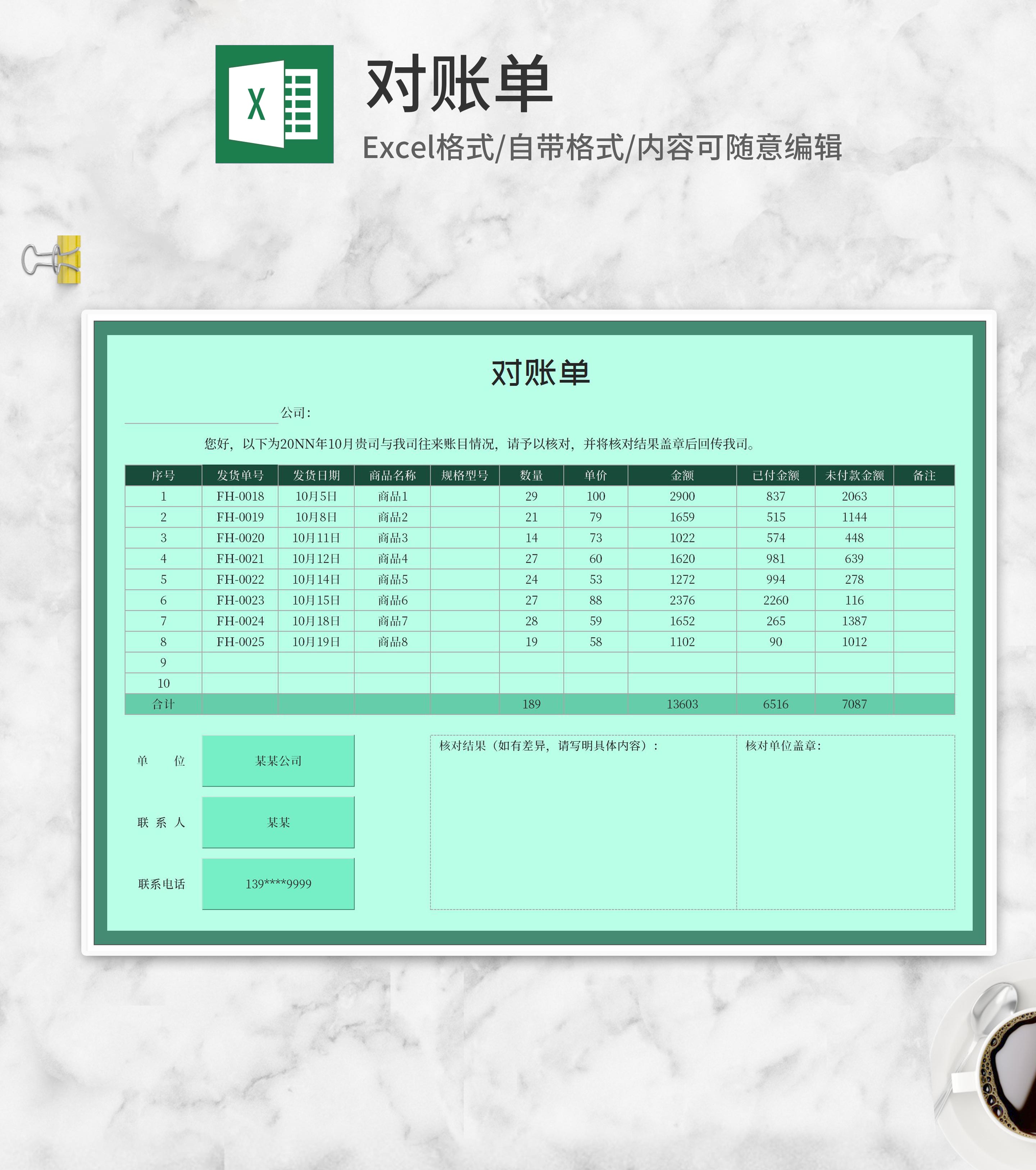 绿色公司商品销售对账单Excel模板