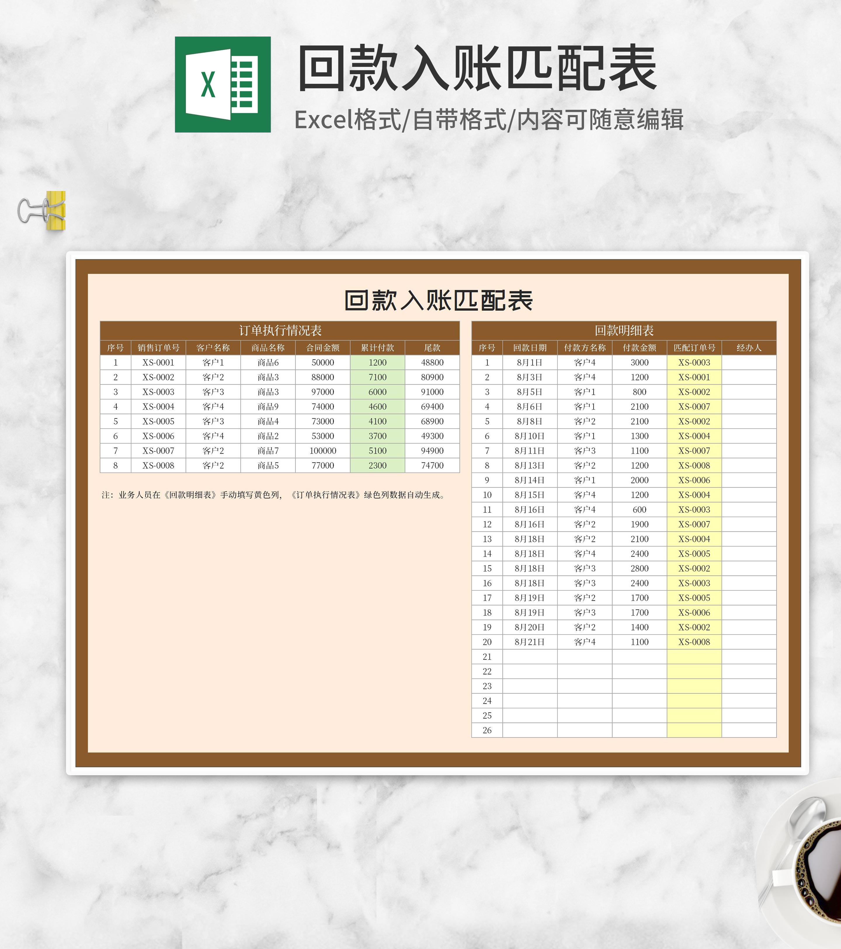 订单回款入账匹配表Excel模板