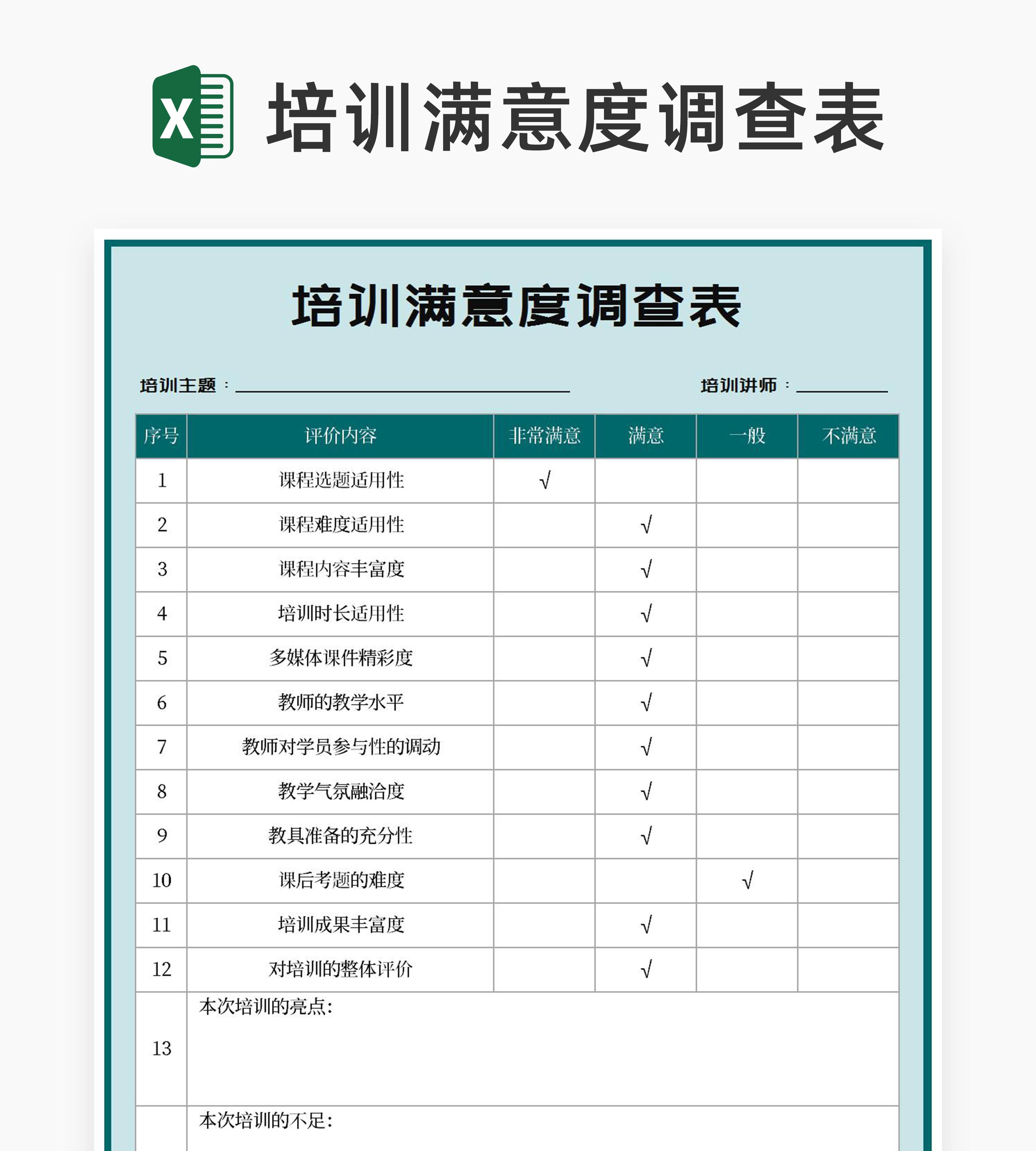 蓝色培训满意度调查表Excel模板