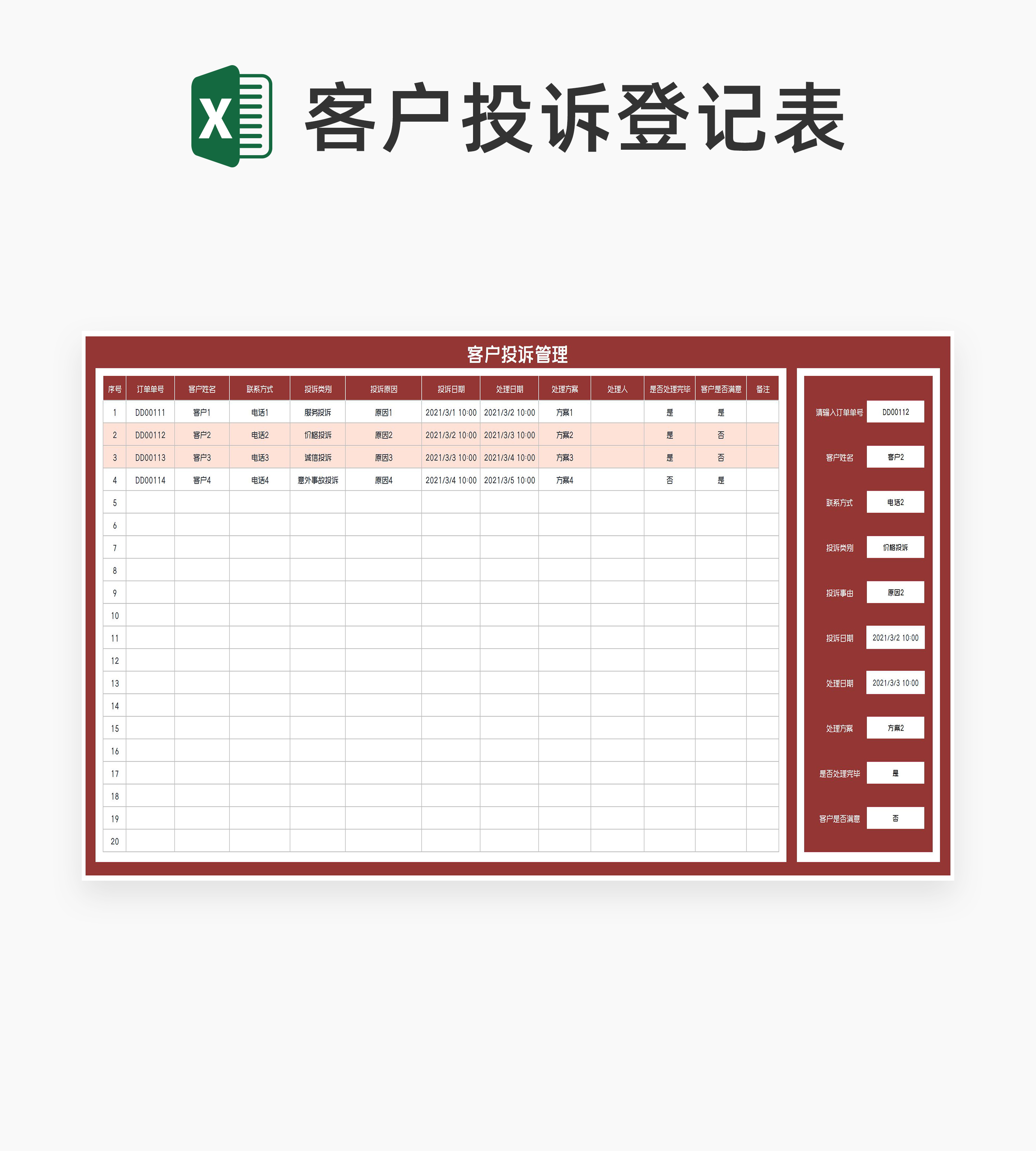 红色订单客户投诉管理登记表Excel模板