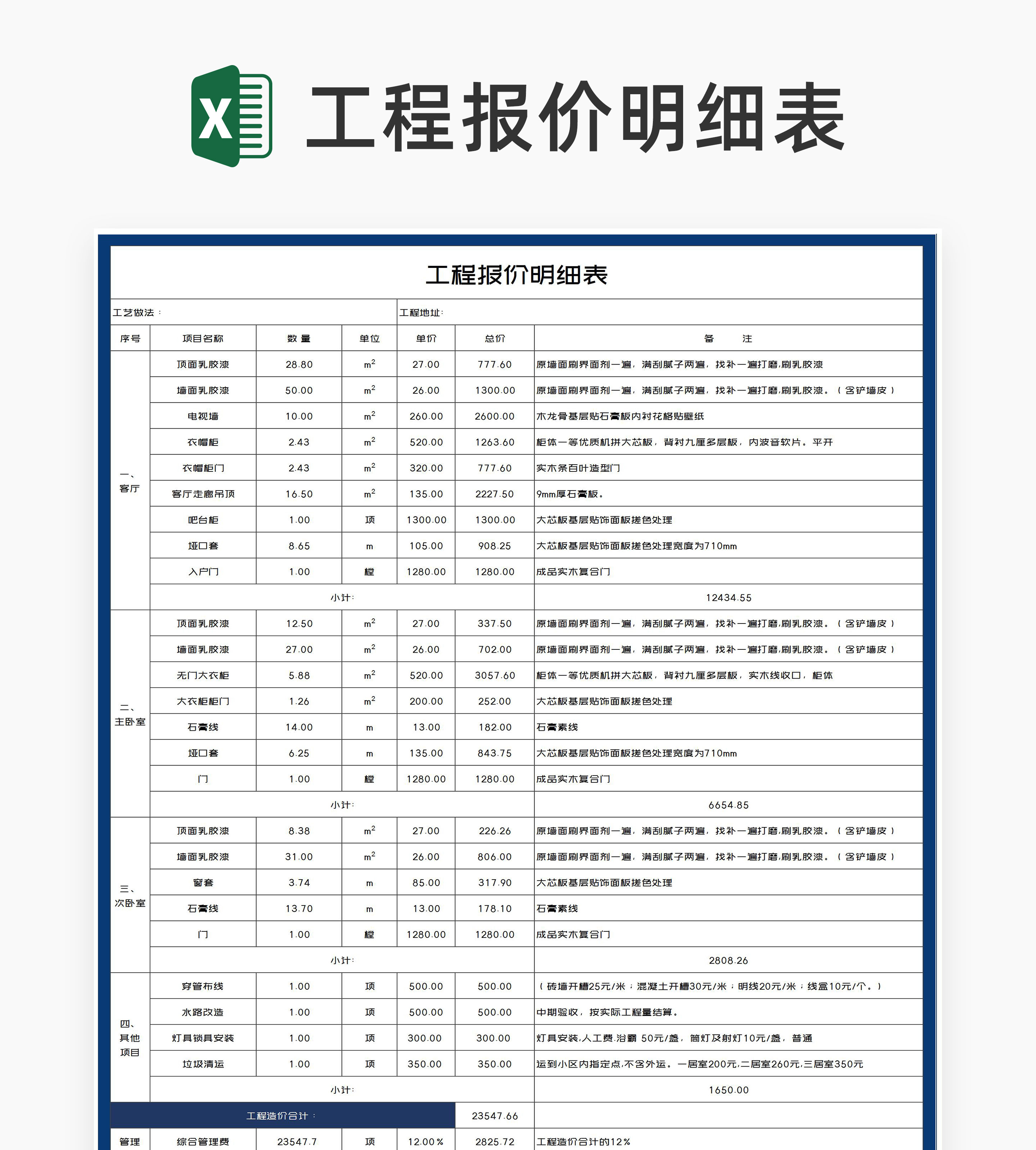深蓝工程造价报价明细表Excel模板