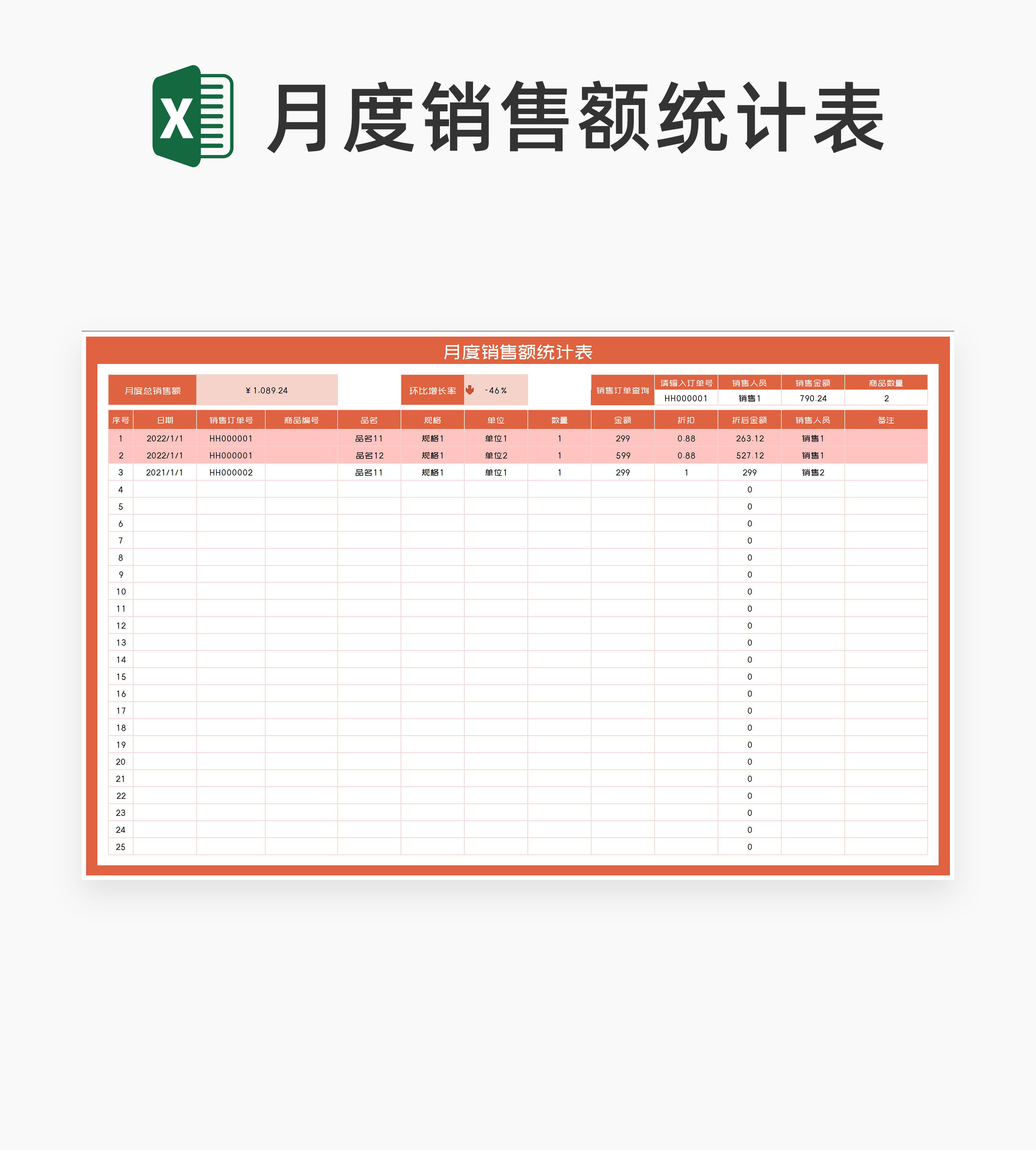 橙色月度商品订单销售额统计表Excel模板