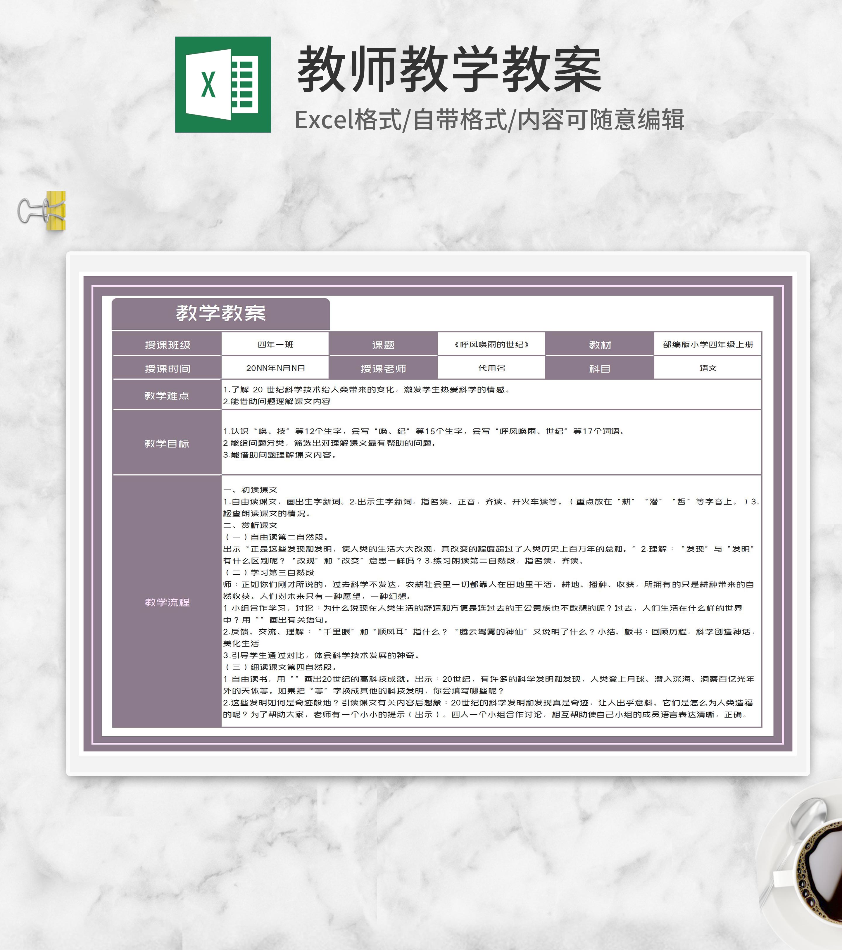 四年级语文课文《呼风唤雨的世纪》教案Excel模板