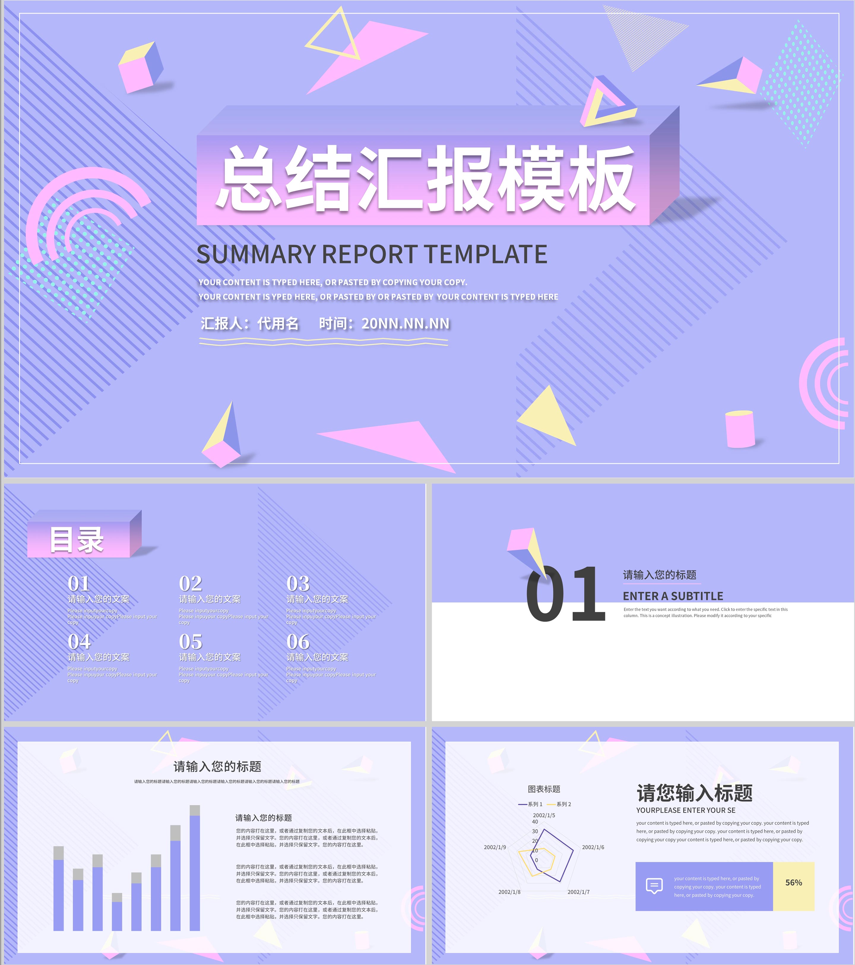 紫色小清新孟菲斯风总结汇报PPT模板