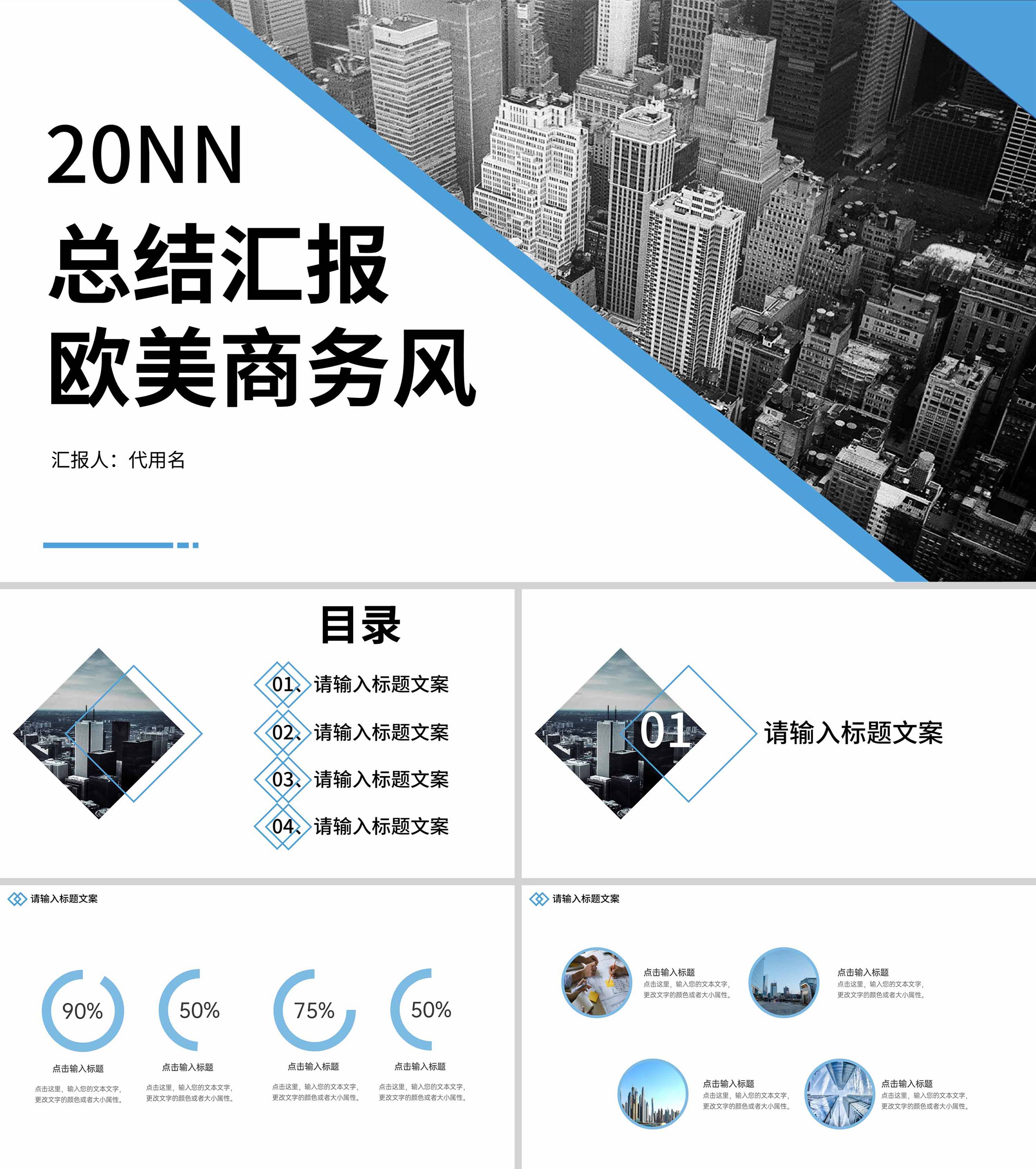 蓝白拼色简约风总结汇报PPT模板