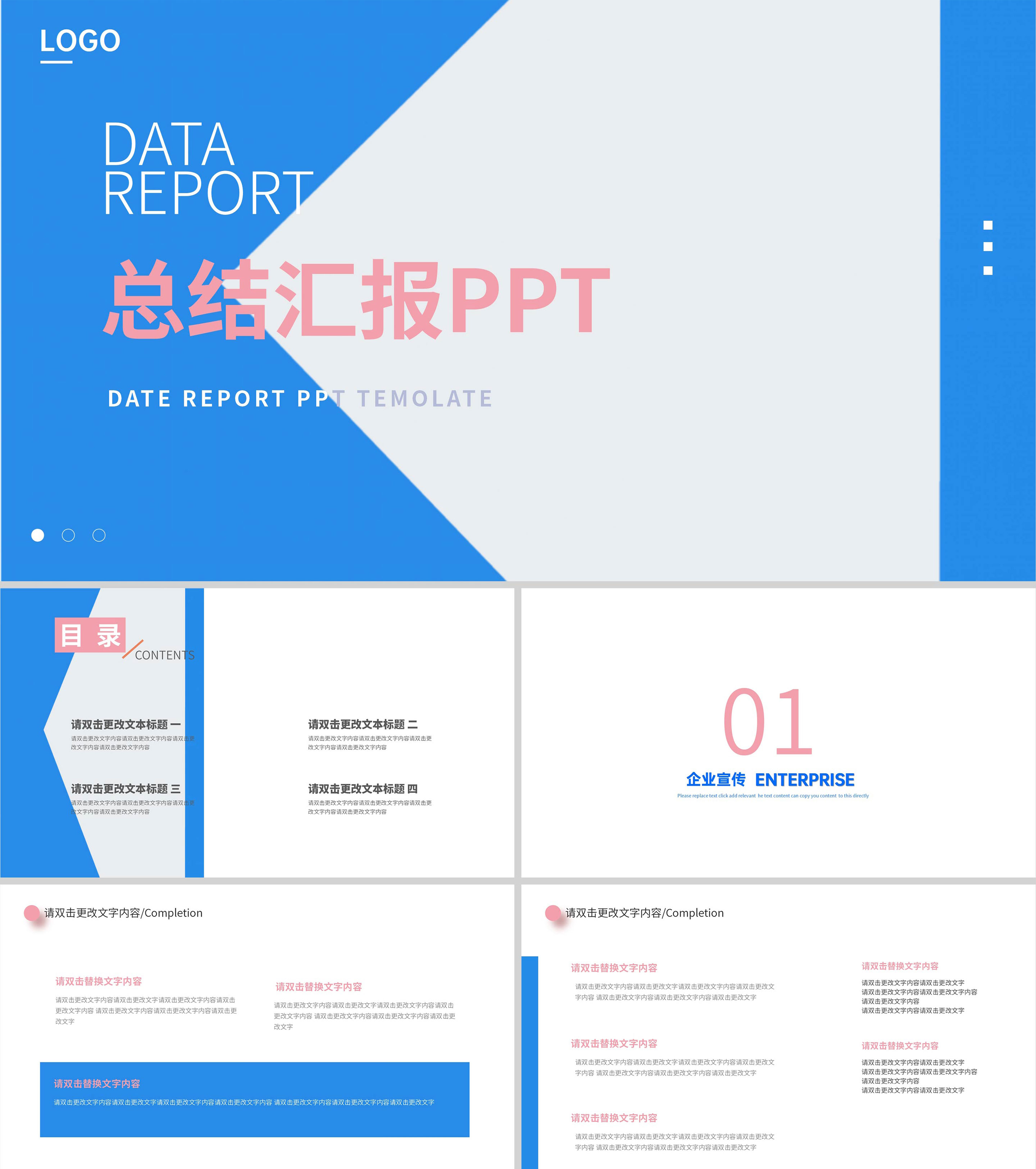蓝色扁平风总结汇报PPT模板
