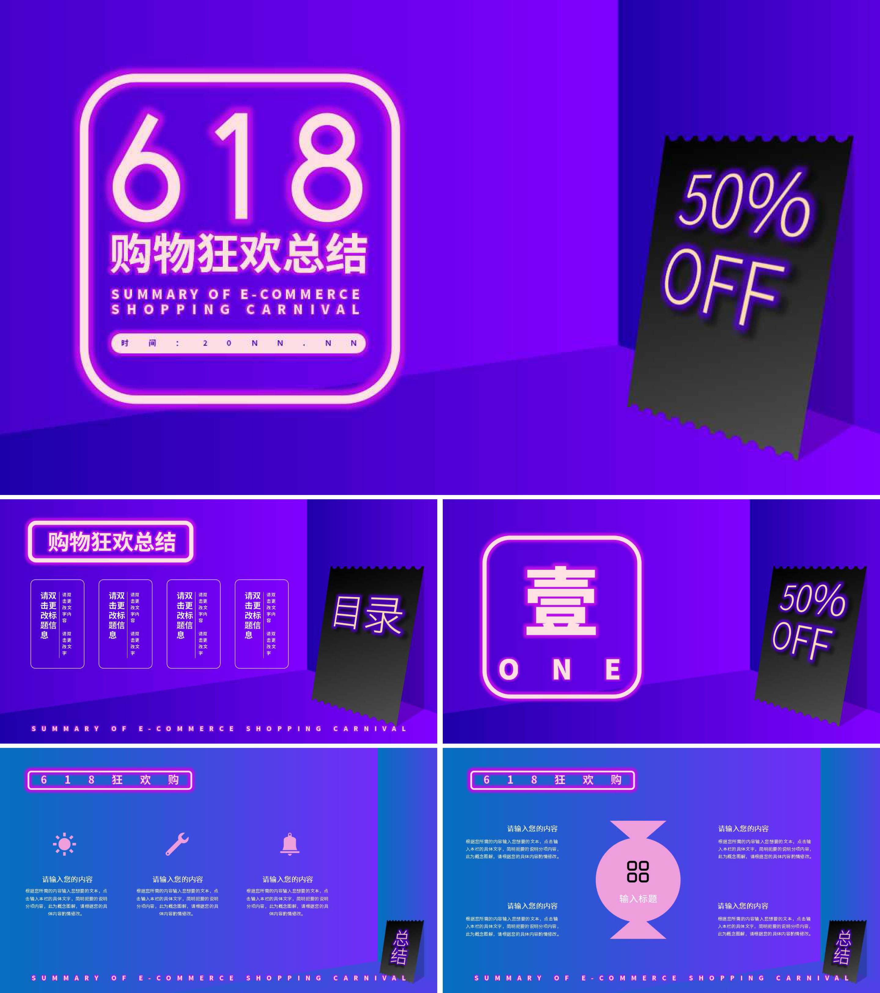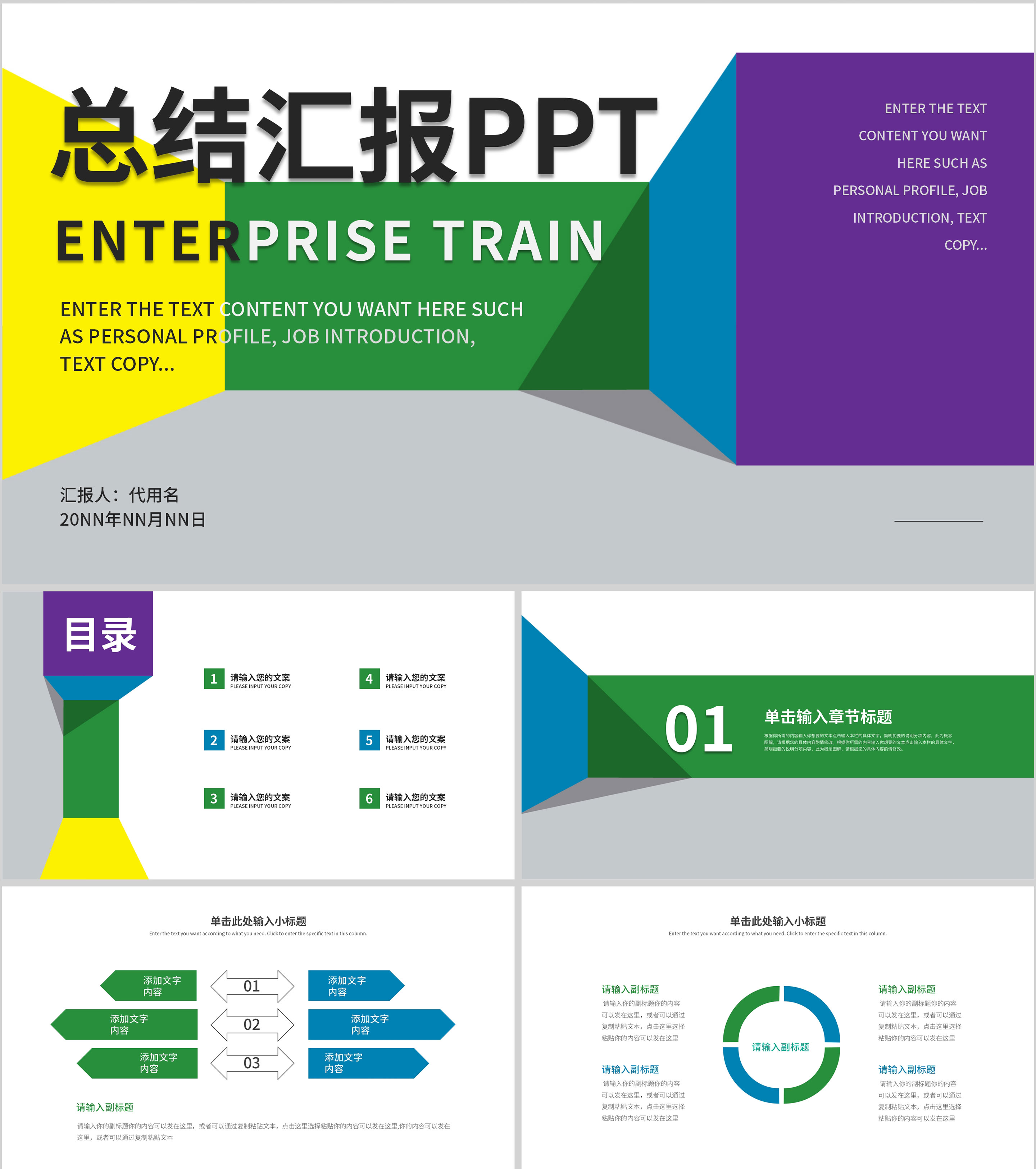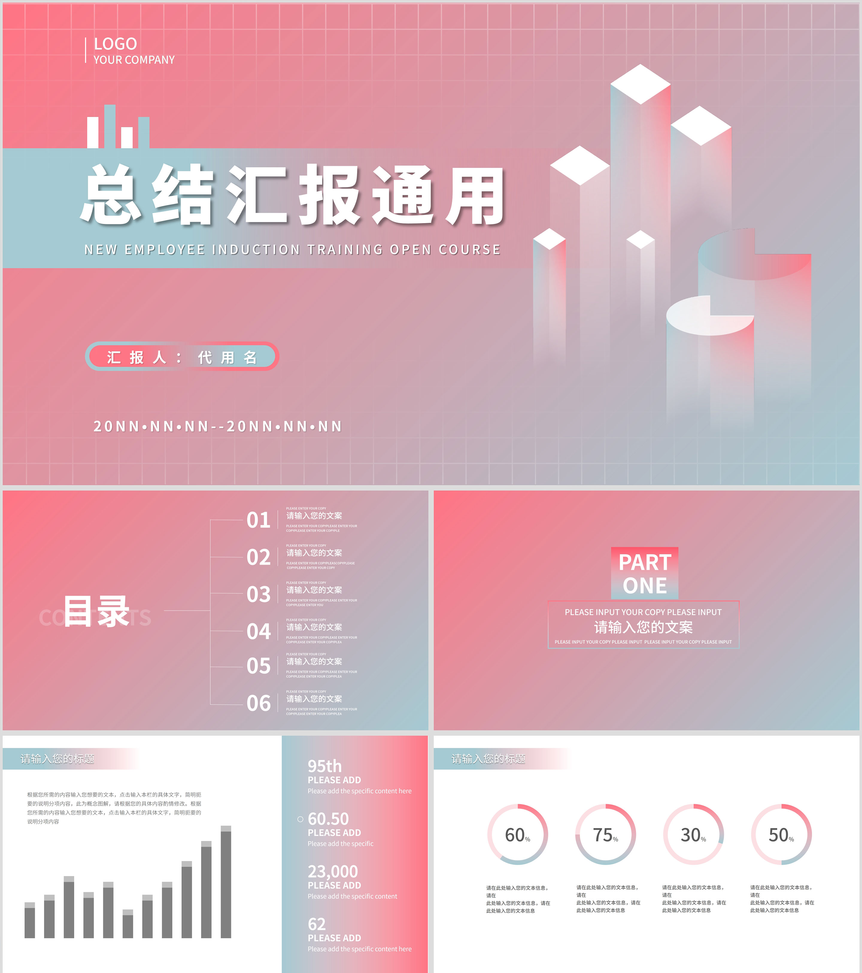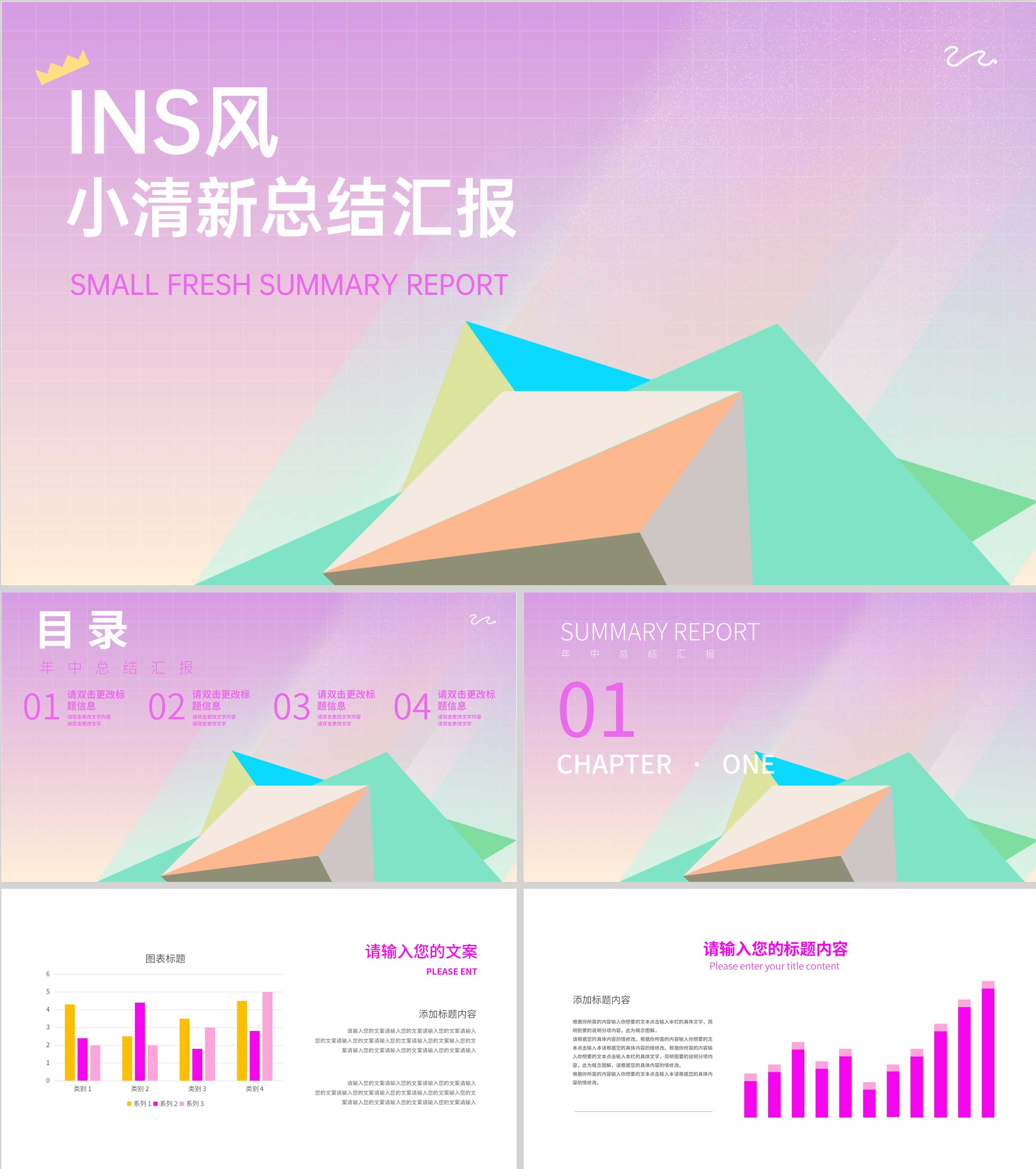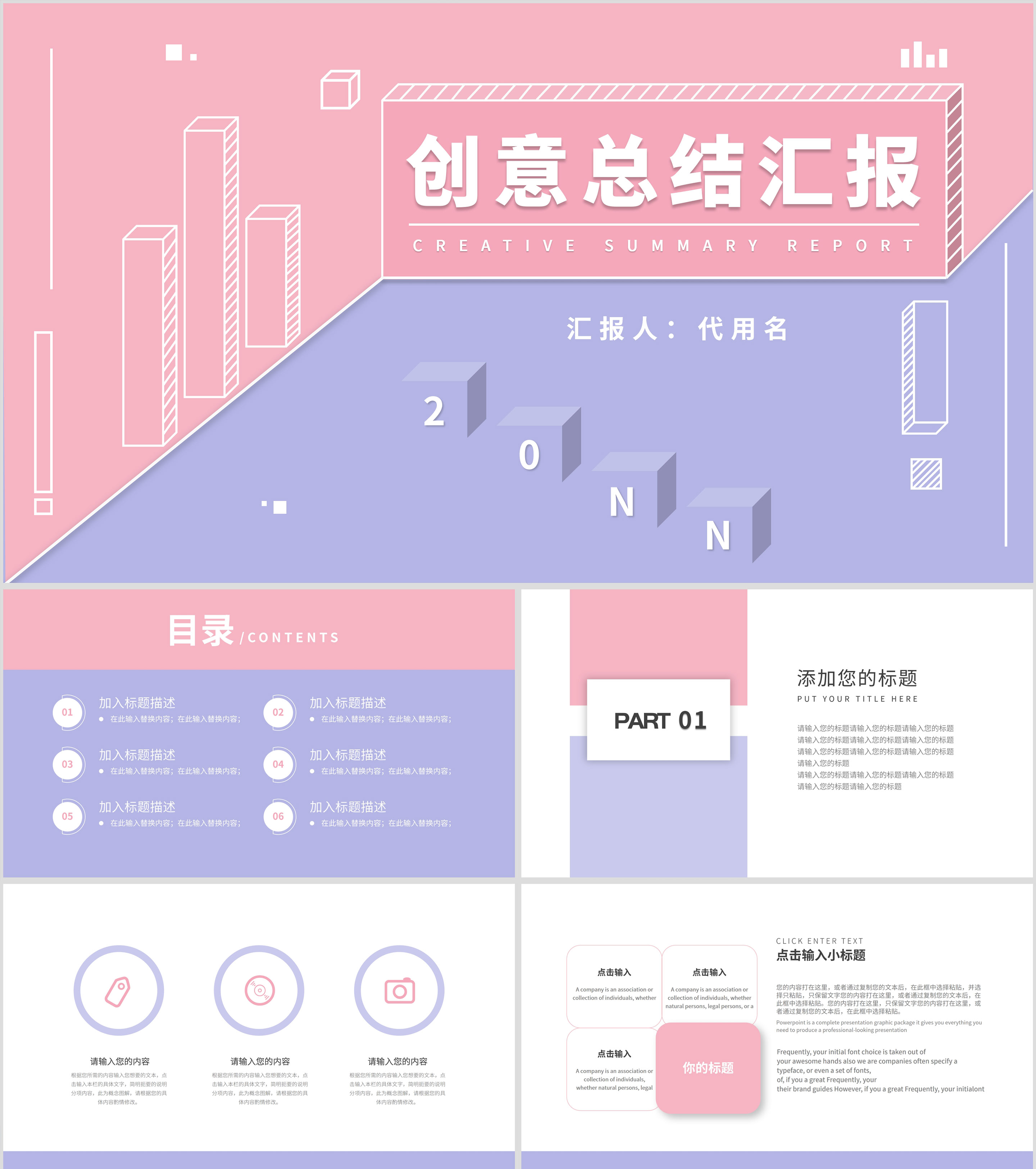 粉紫拼色简约风几何创意总结汇报PPT模板