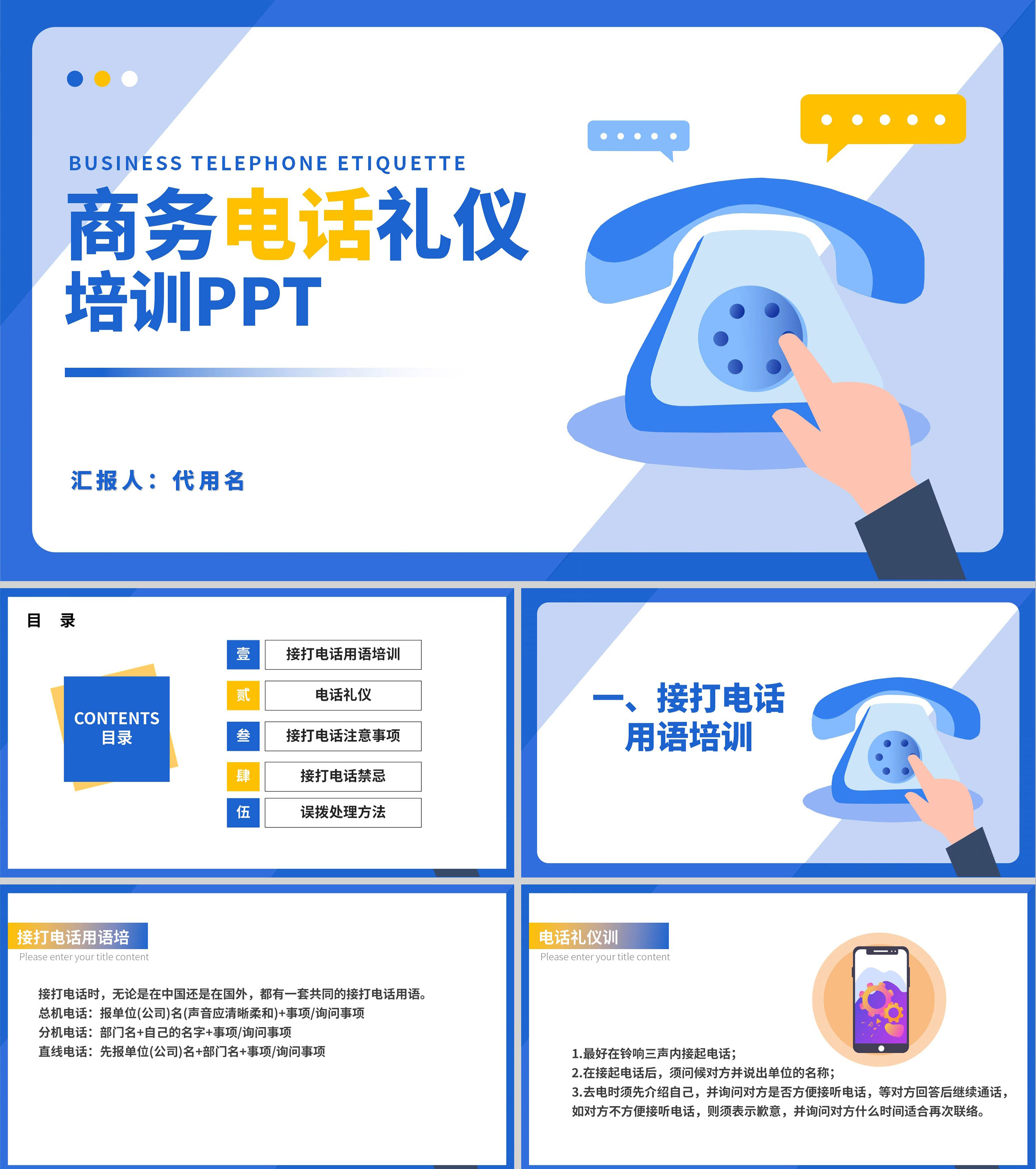蓝色扁平风电话销售接待礼仪培训PPT模板