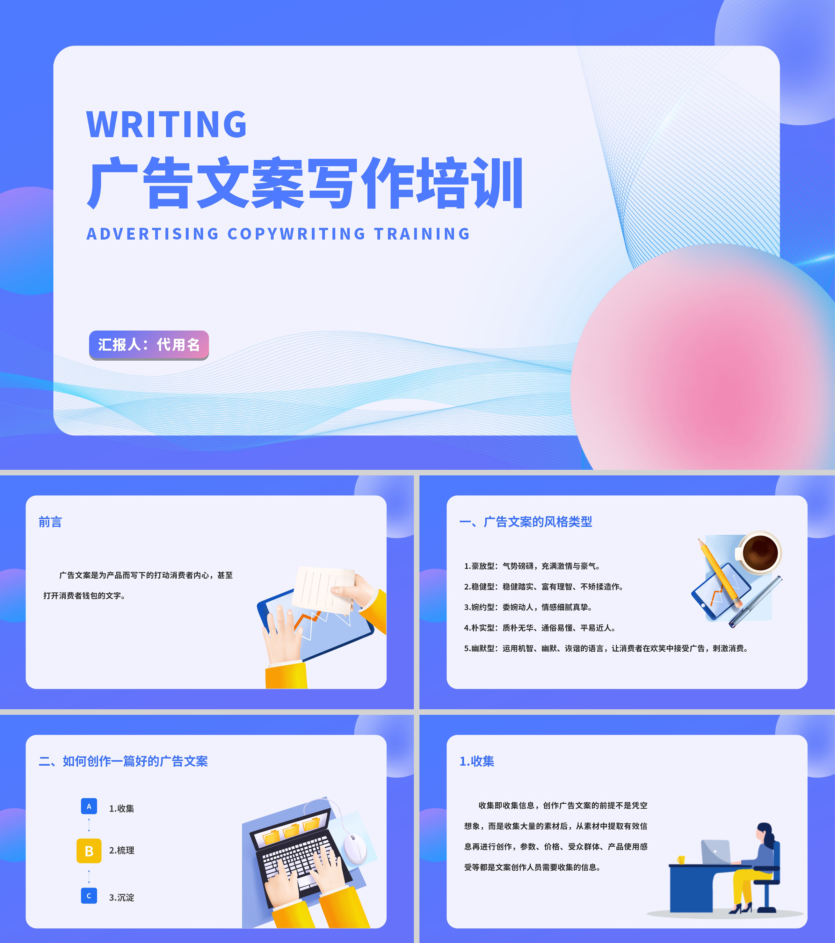 蓝色扁平风新媒体创意广告文案写作培训PPT模板
