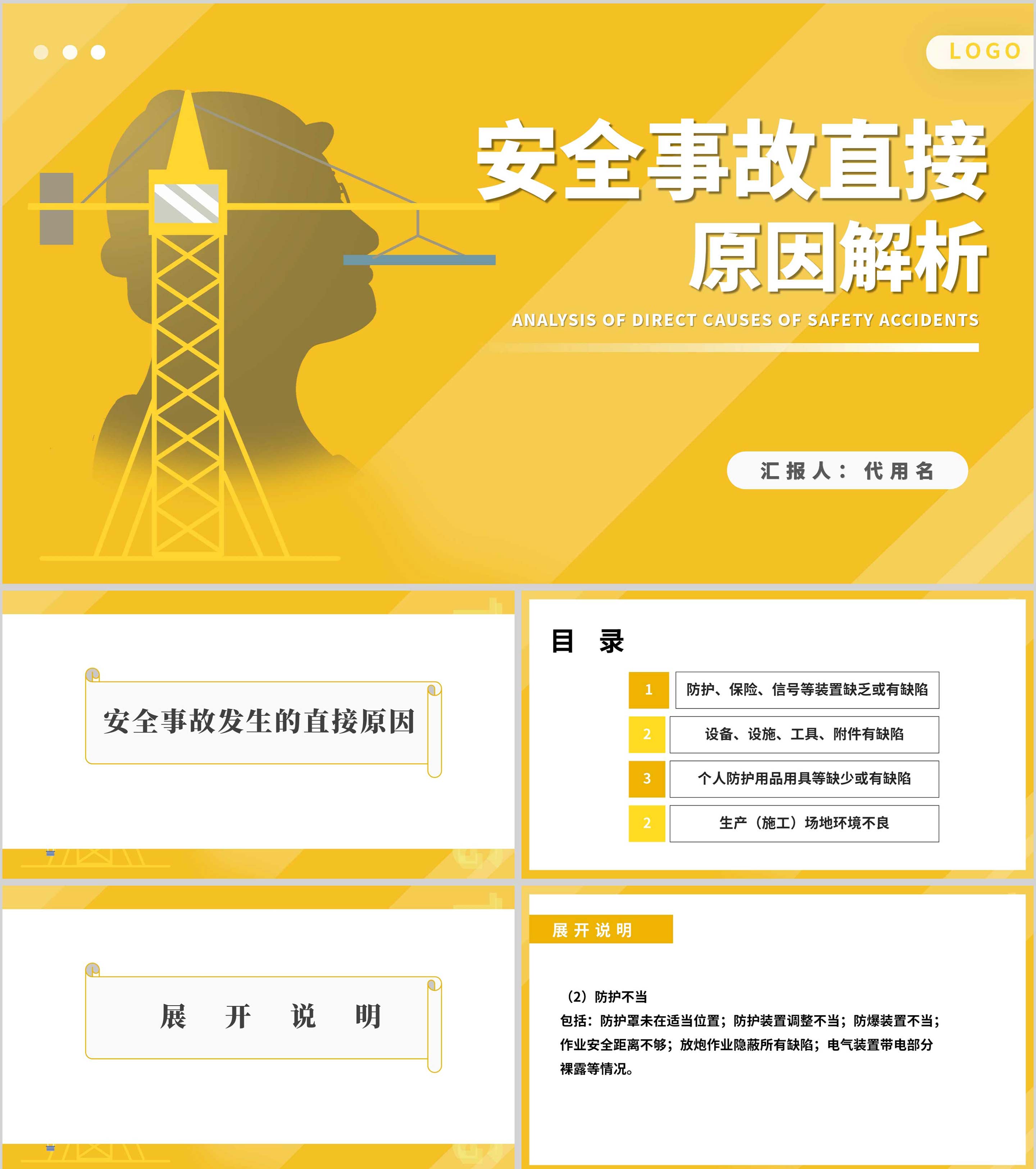 黄色插画风工地安全事故直接原因解析培训PPT模板