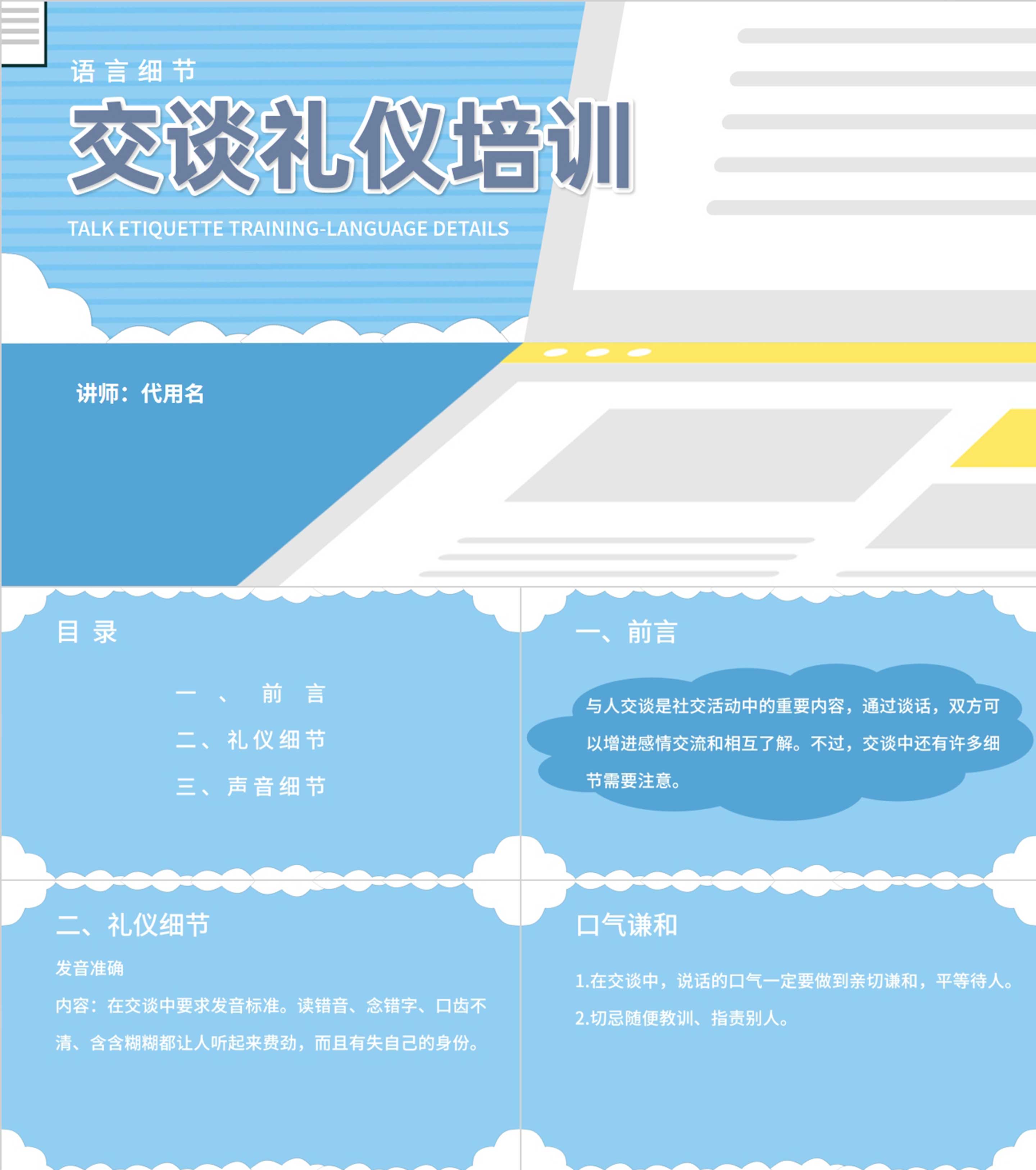 蓝色扁平风交谈商务礼仪培训PPT模板