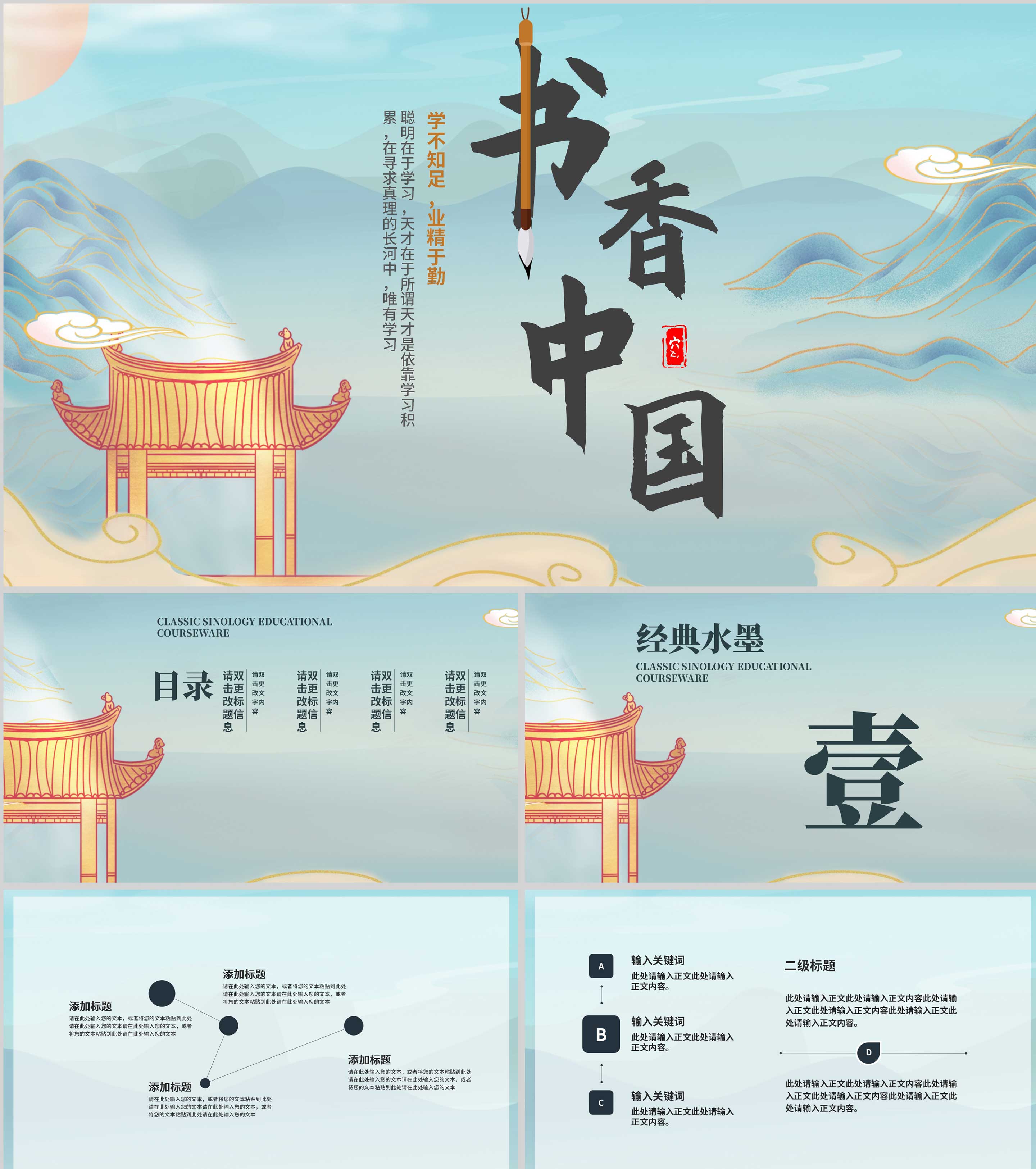 蓝色鎏金风书香中国PPT模板