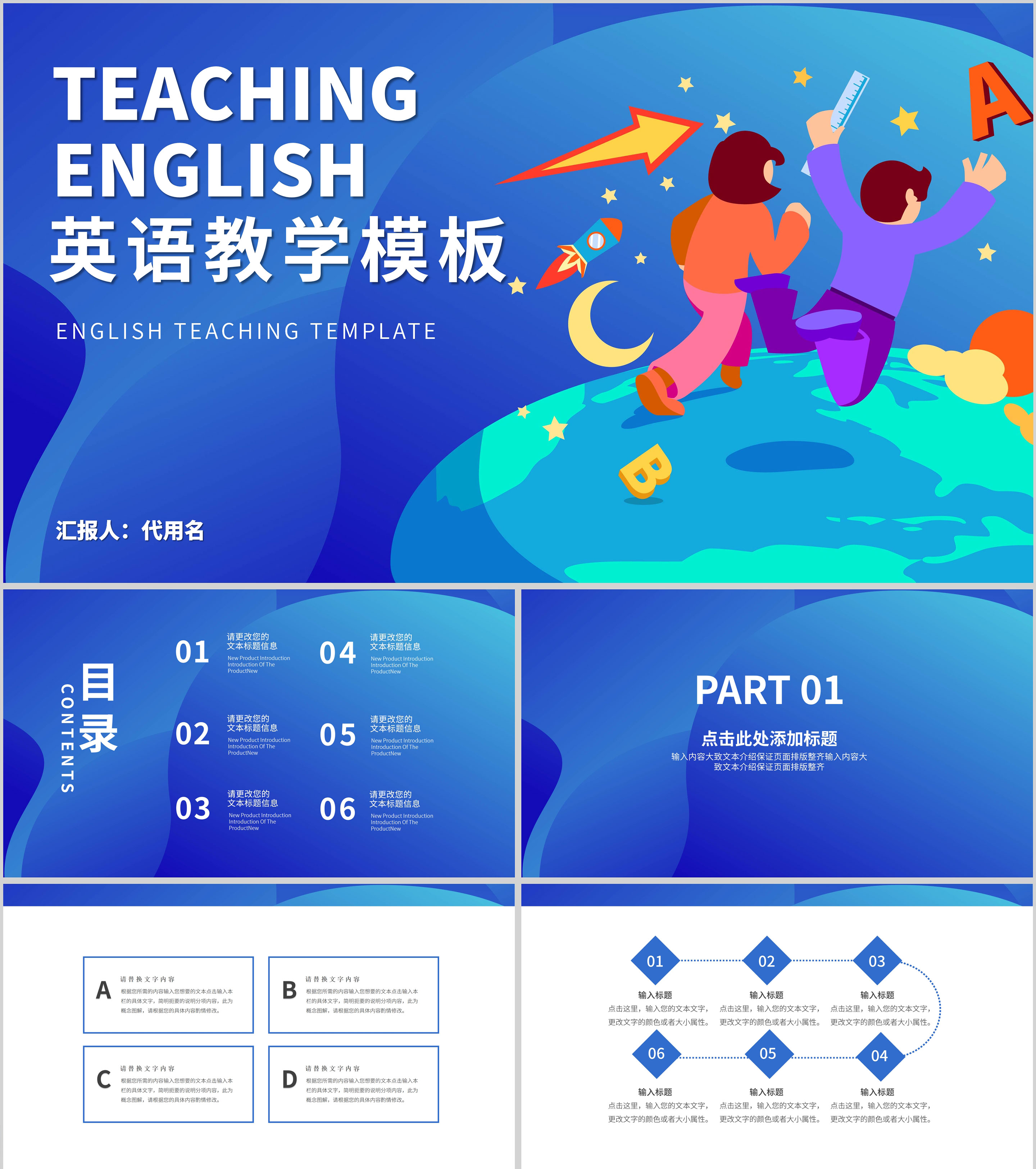 蓝色插画风英语教学PPT模板