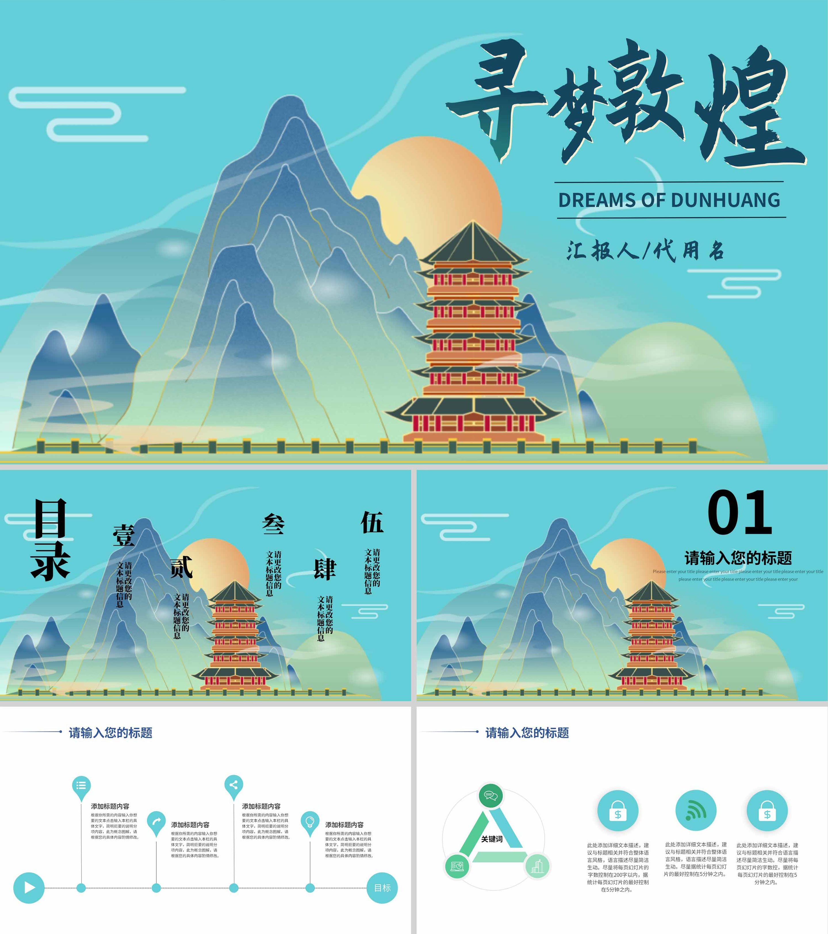 蓝色远山中国风寻梦敦煌PPT模板