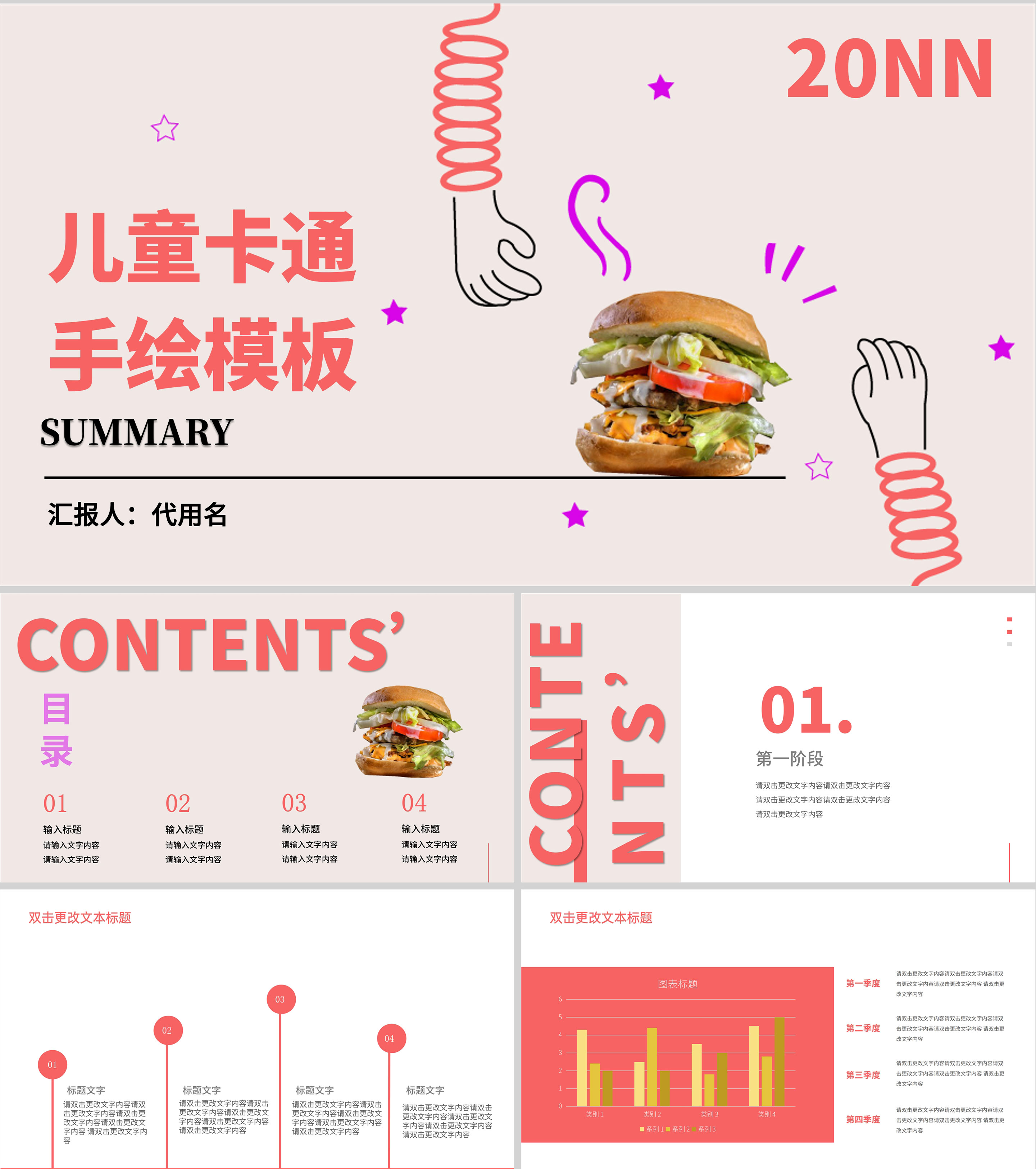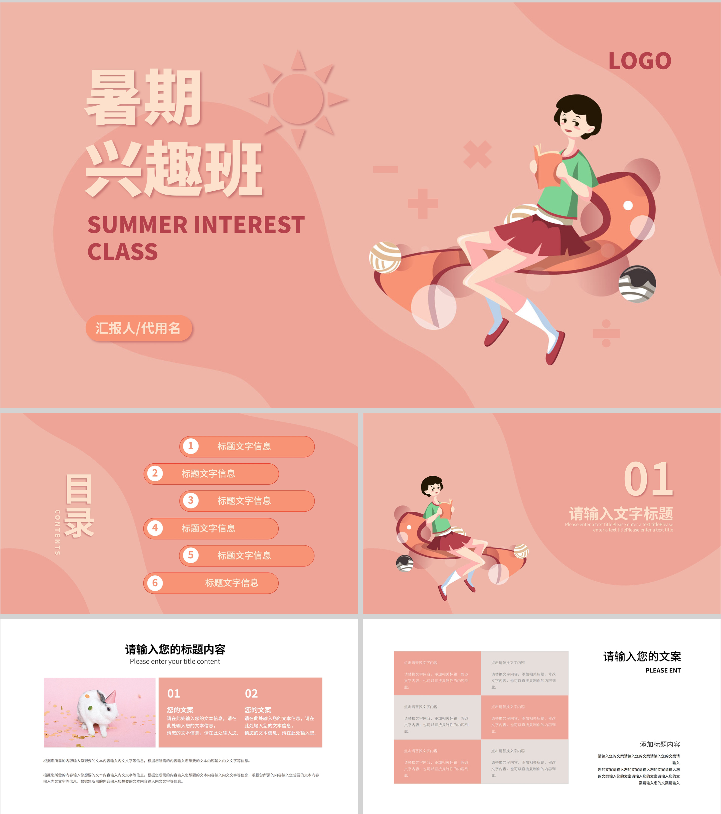 粉红色插画风暑期兴趣班PPT模板