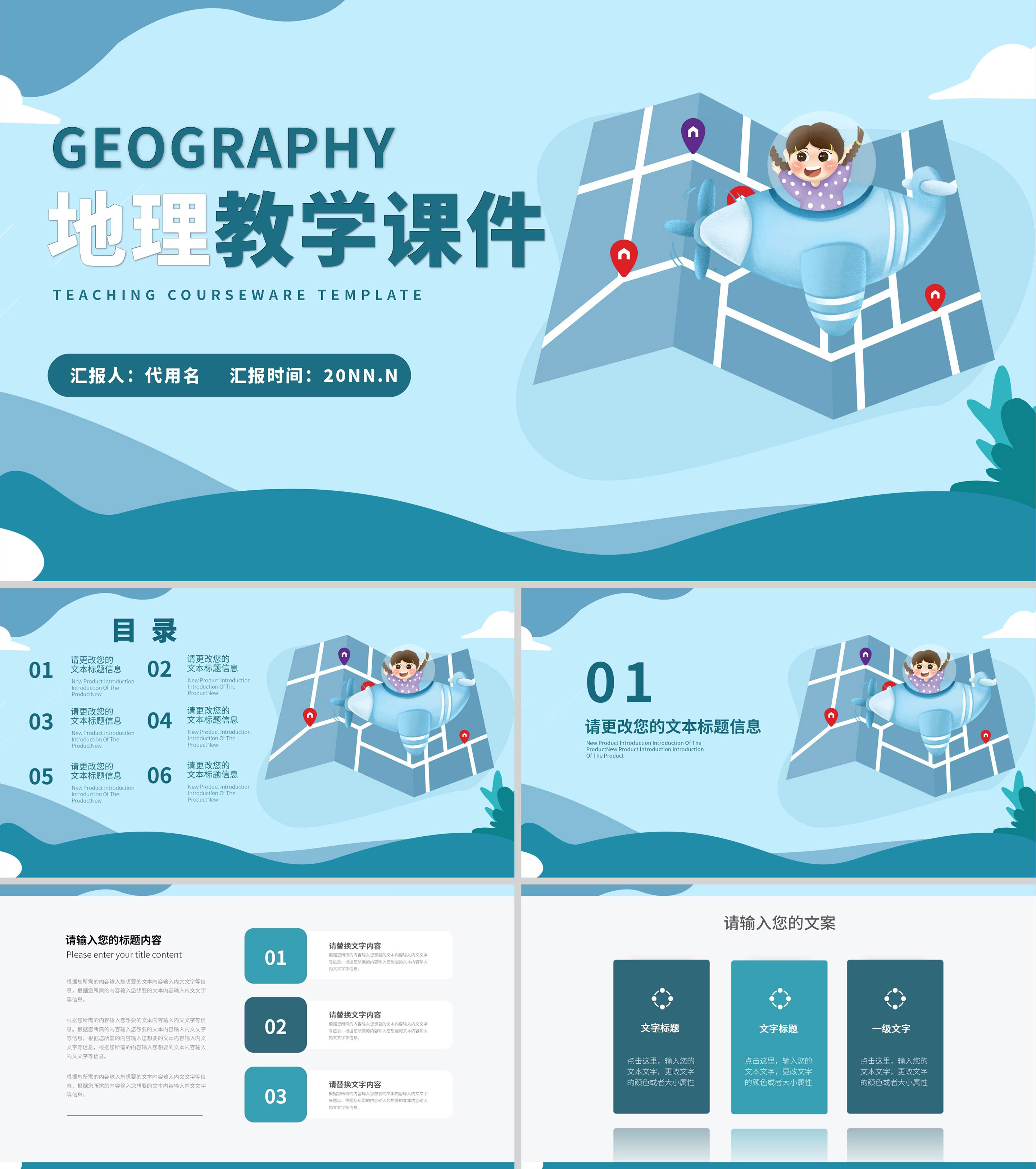 卡通蓝色地理教学汇报PPT模板