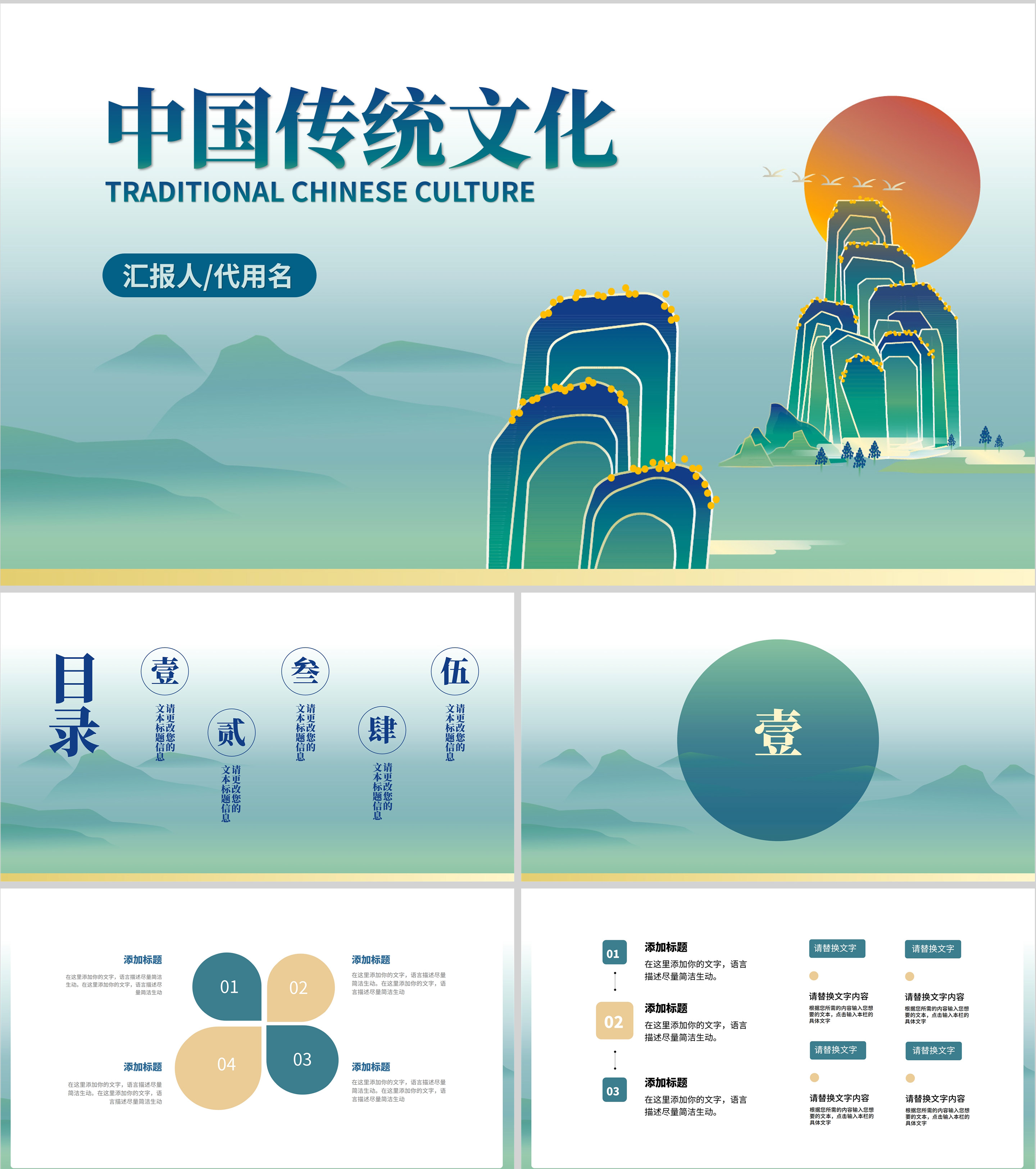 蓝色中国风中国传统文化主题教育教学PPT模板