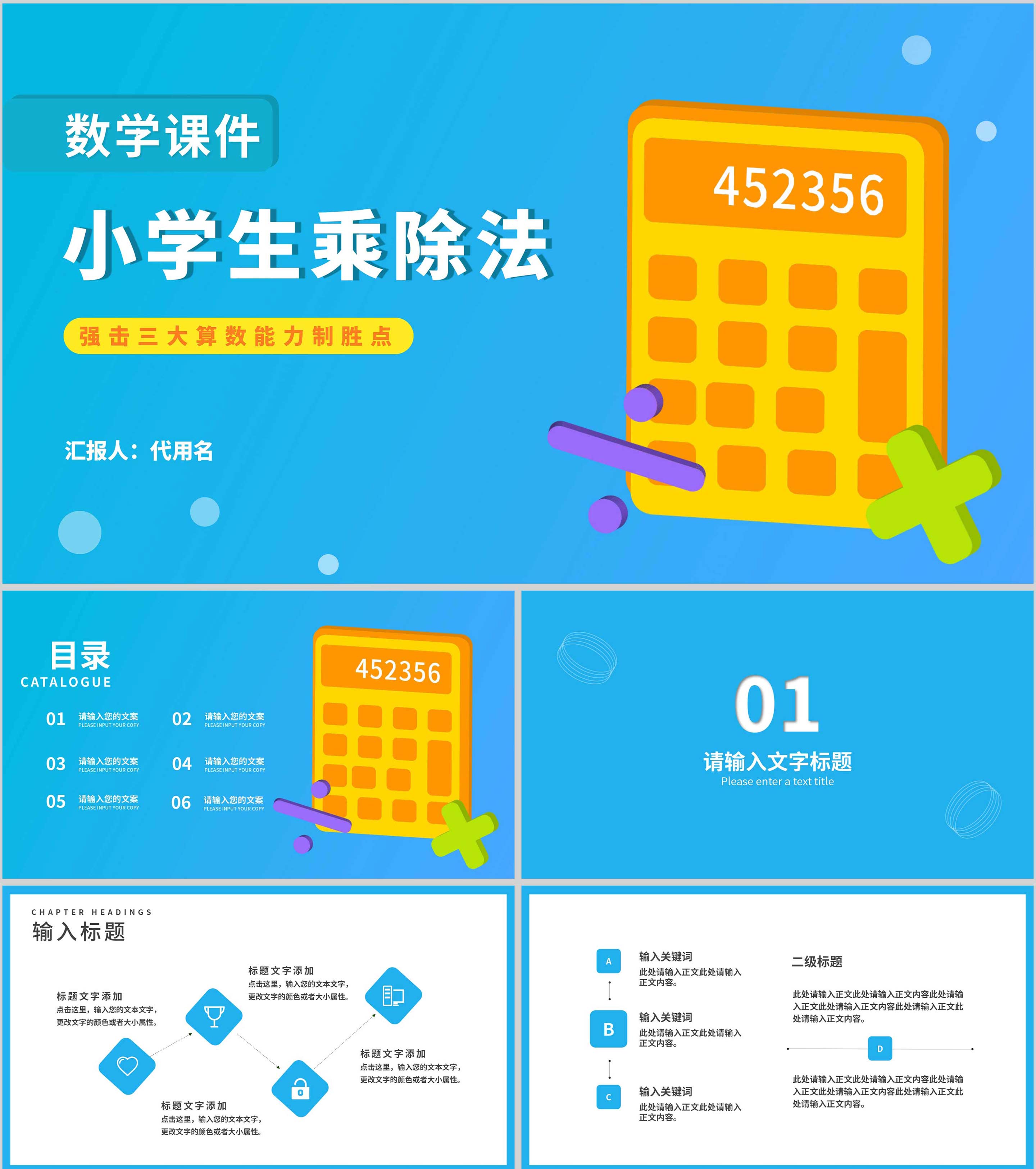 蓝色卡通风计算器小学生乘除法教学PPT模板