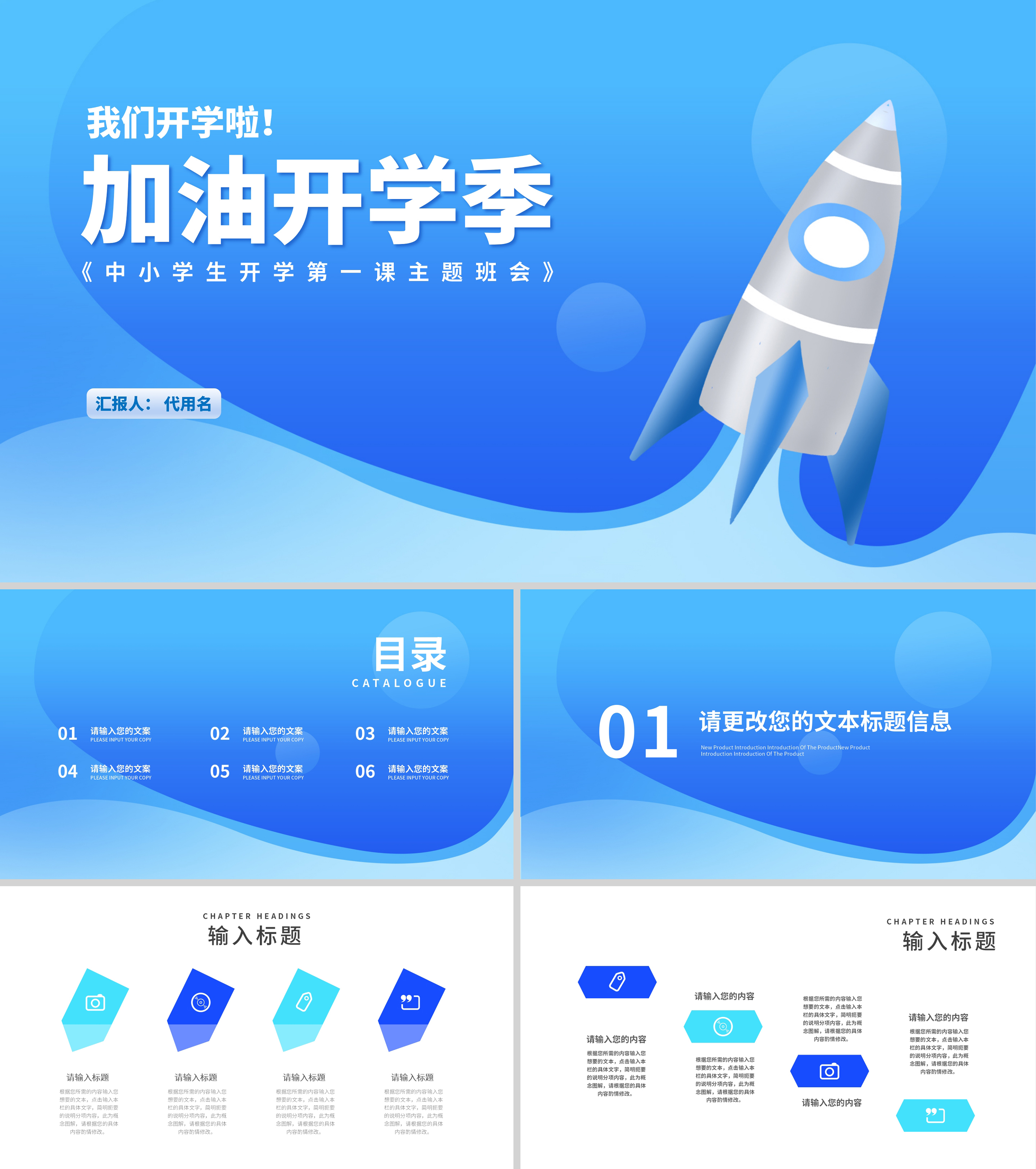渐变蓝色火箭中小学生开学第一课主题班会PPT模板