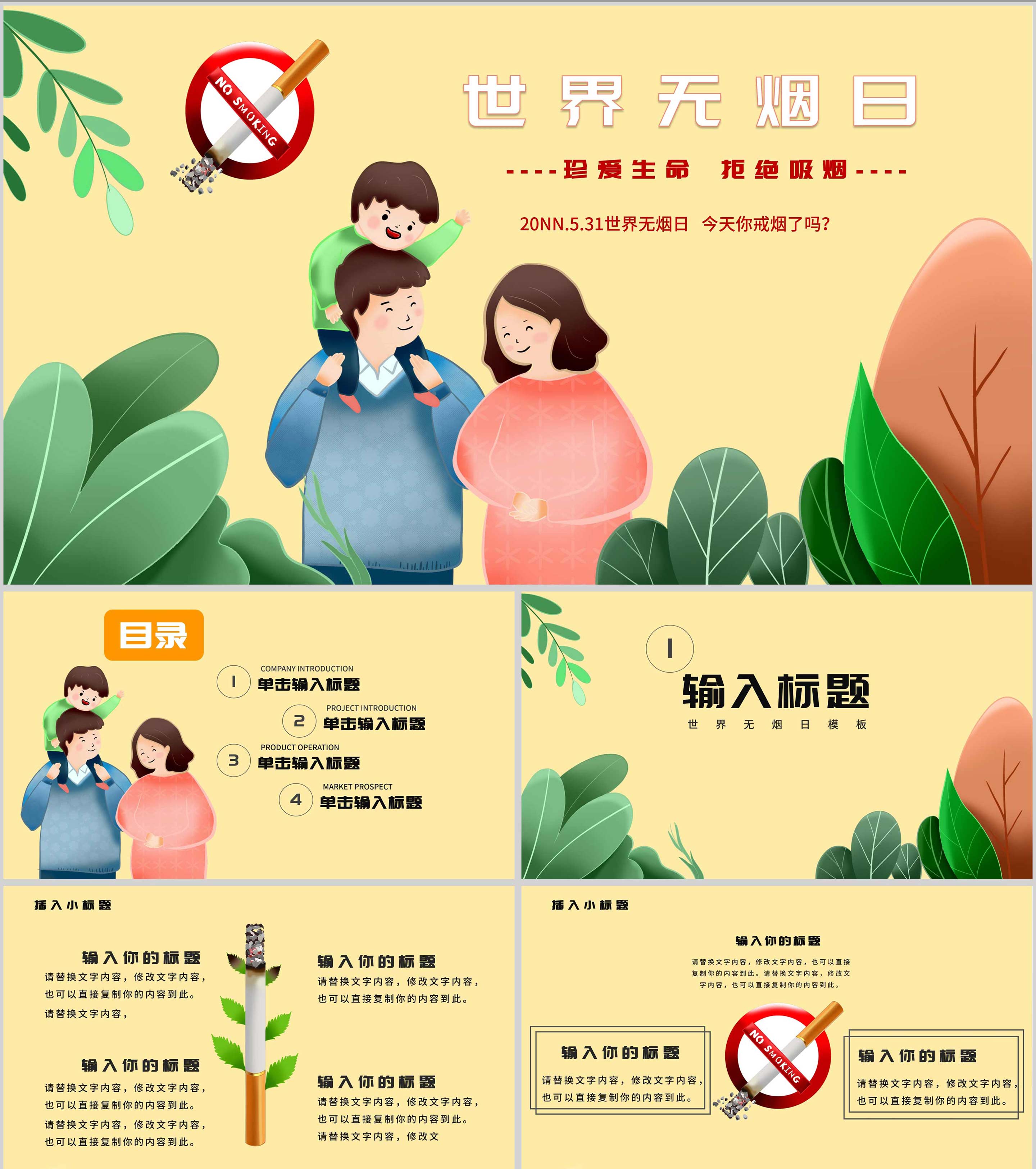 黄色卡通风世界无烟日戒烟宣传教育PPT模板