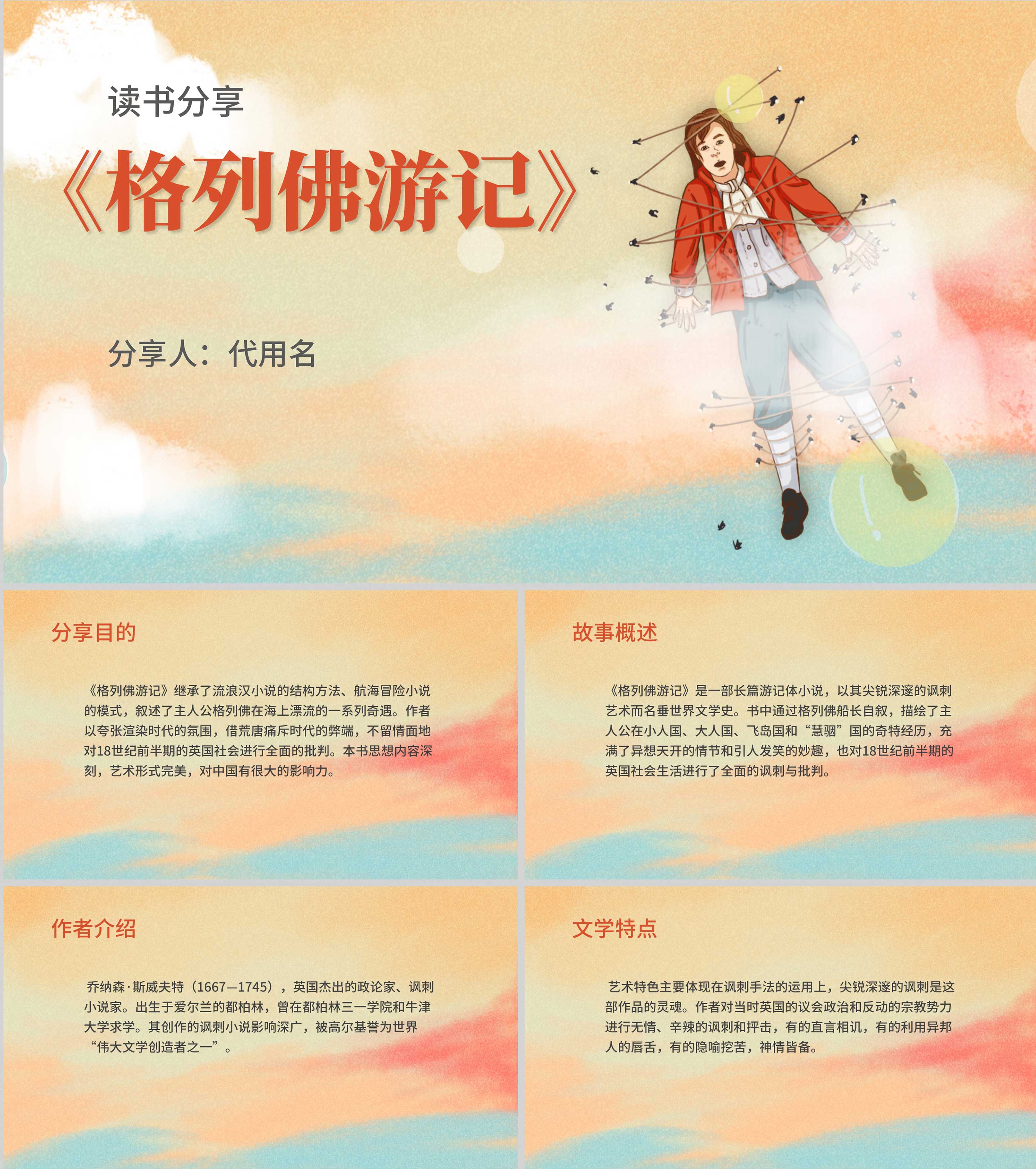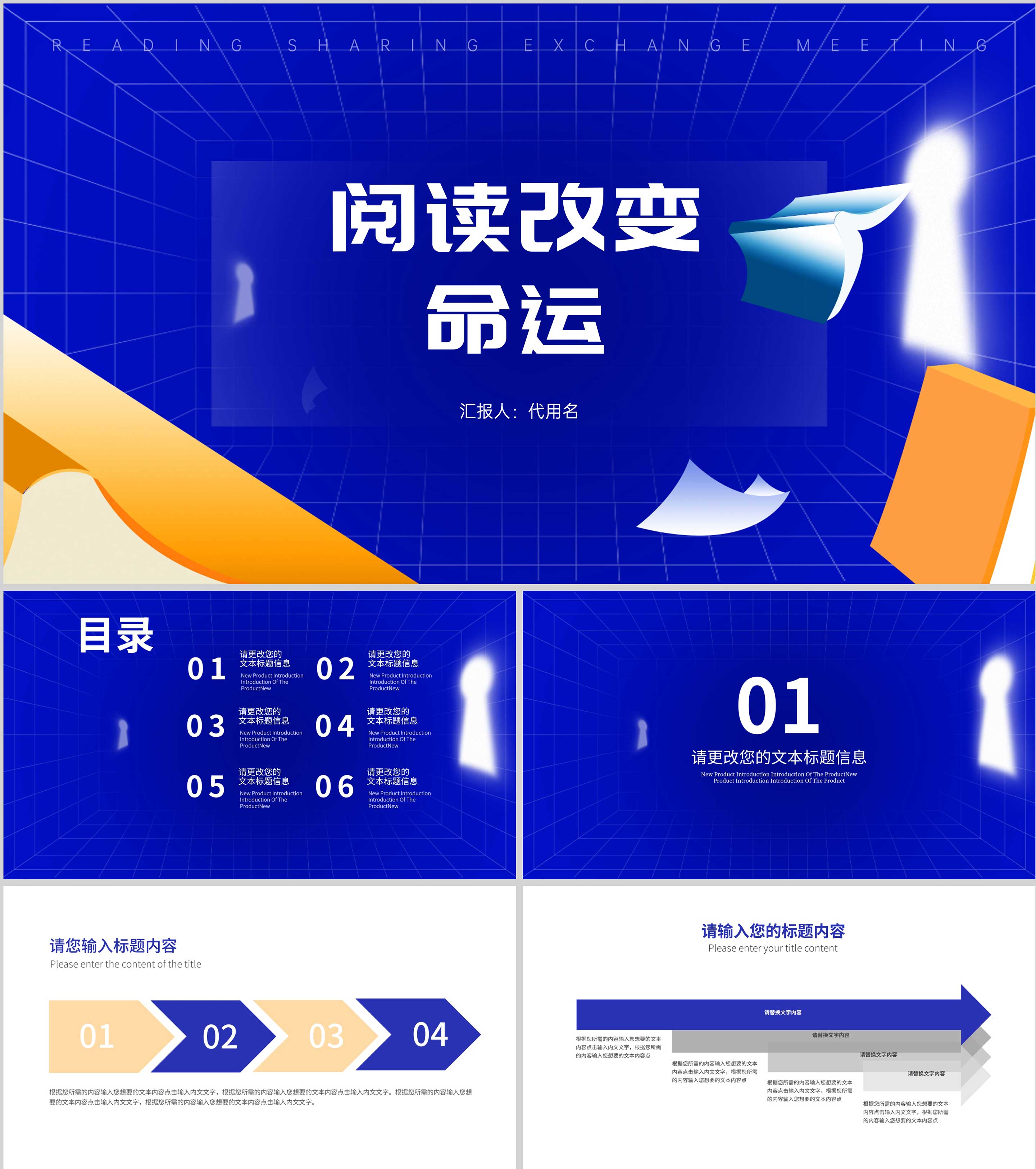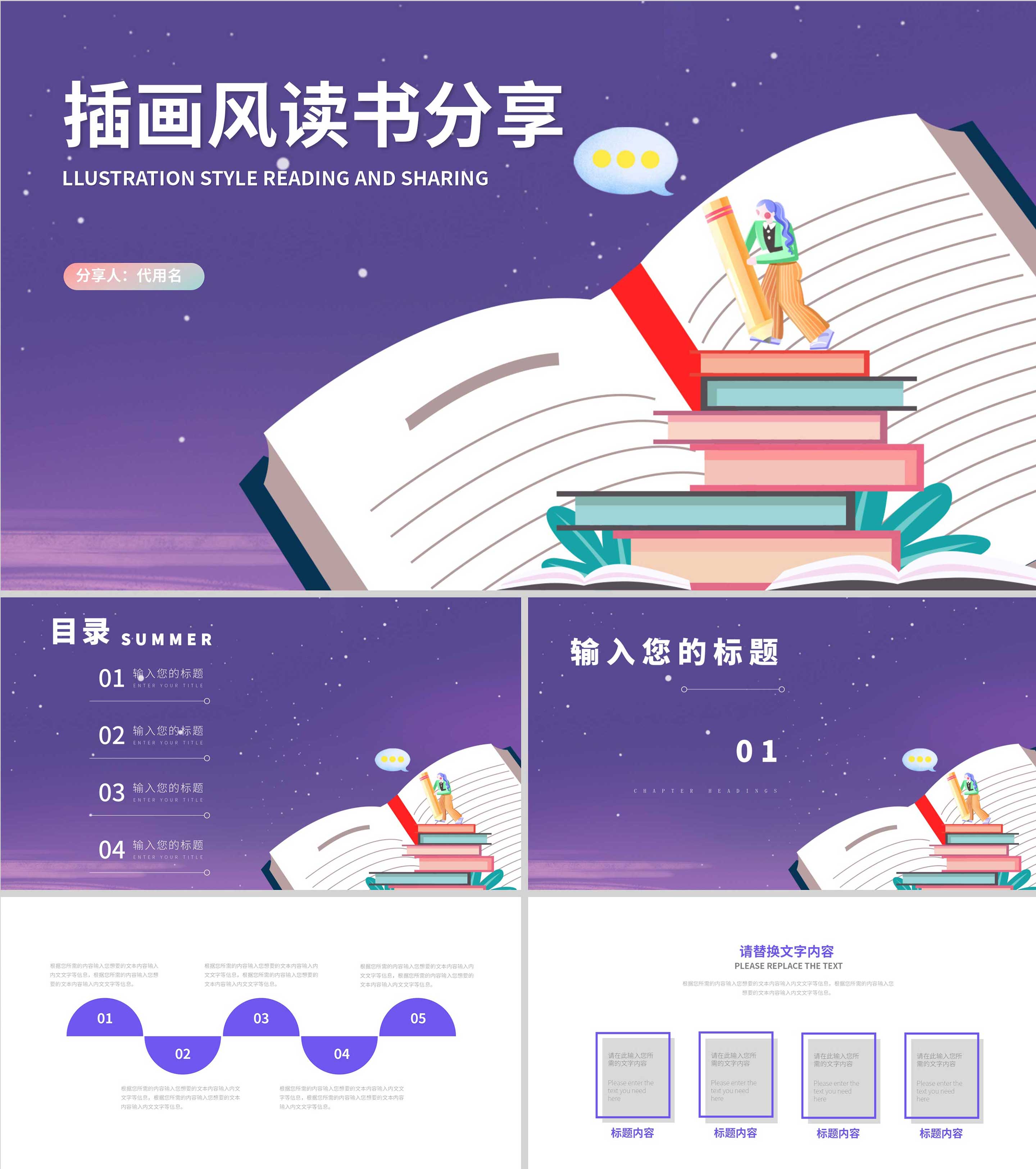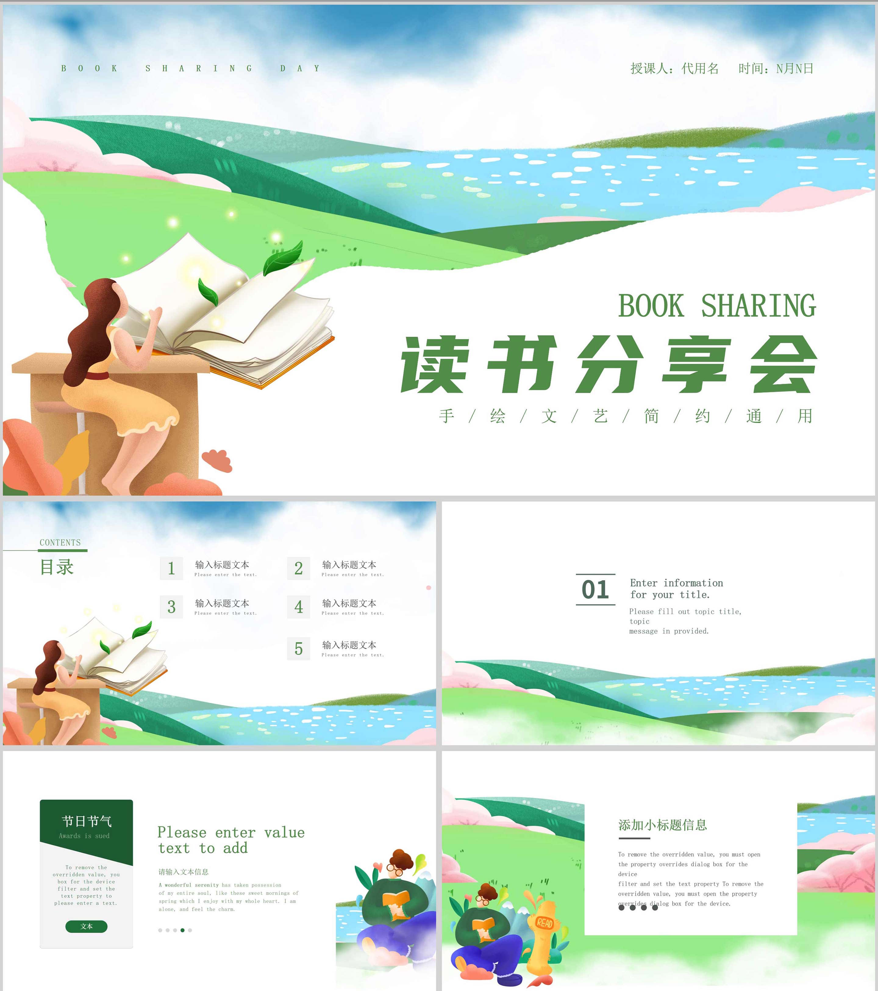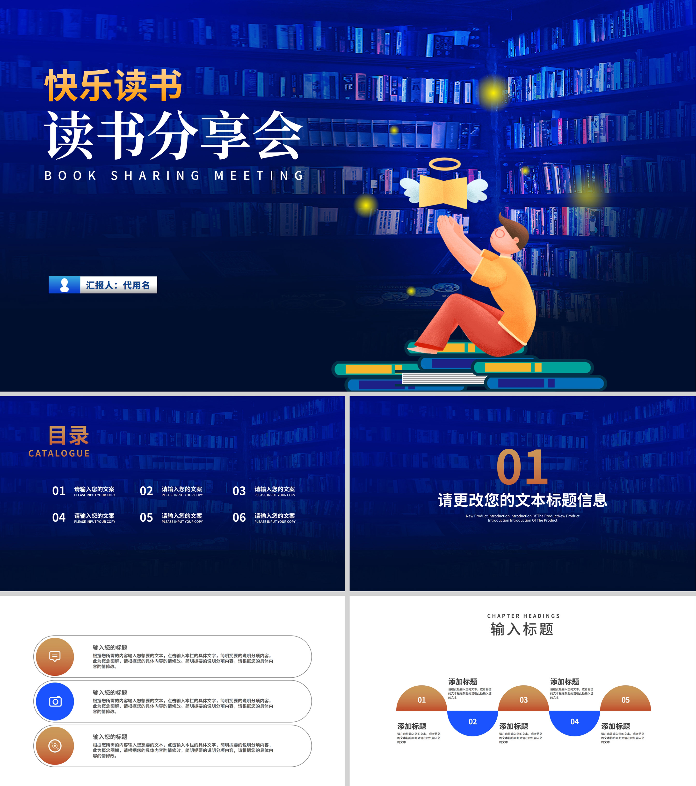 深蓝卡通风渐变读书分享会汇报PPT模板