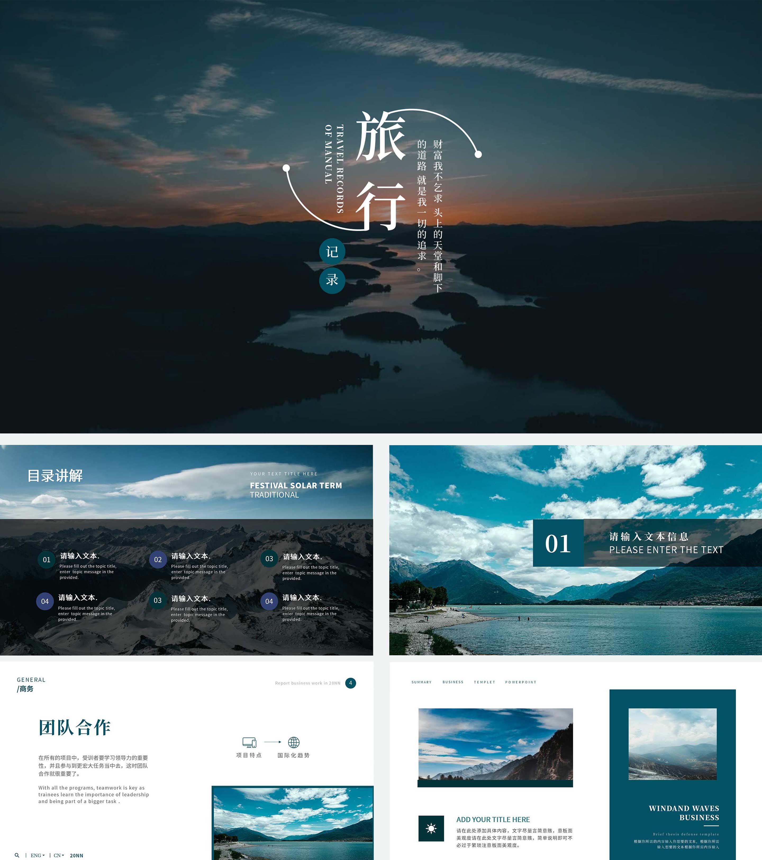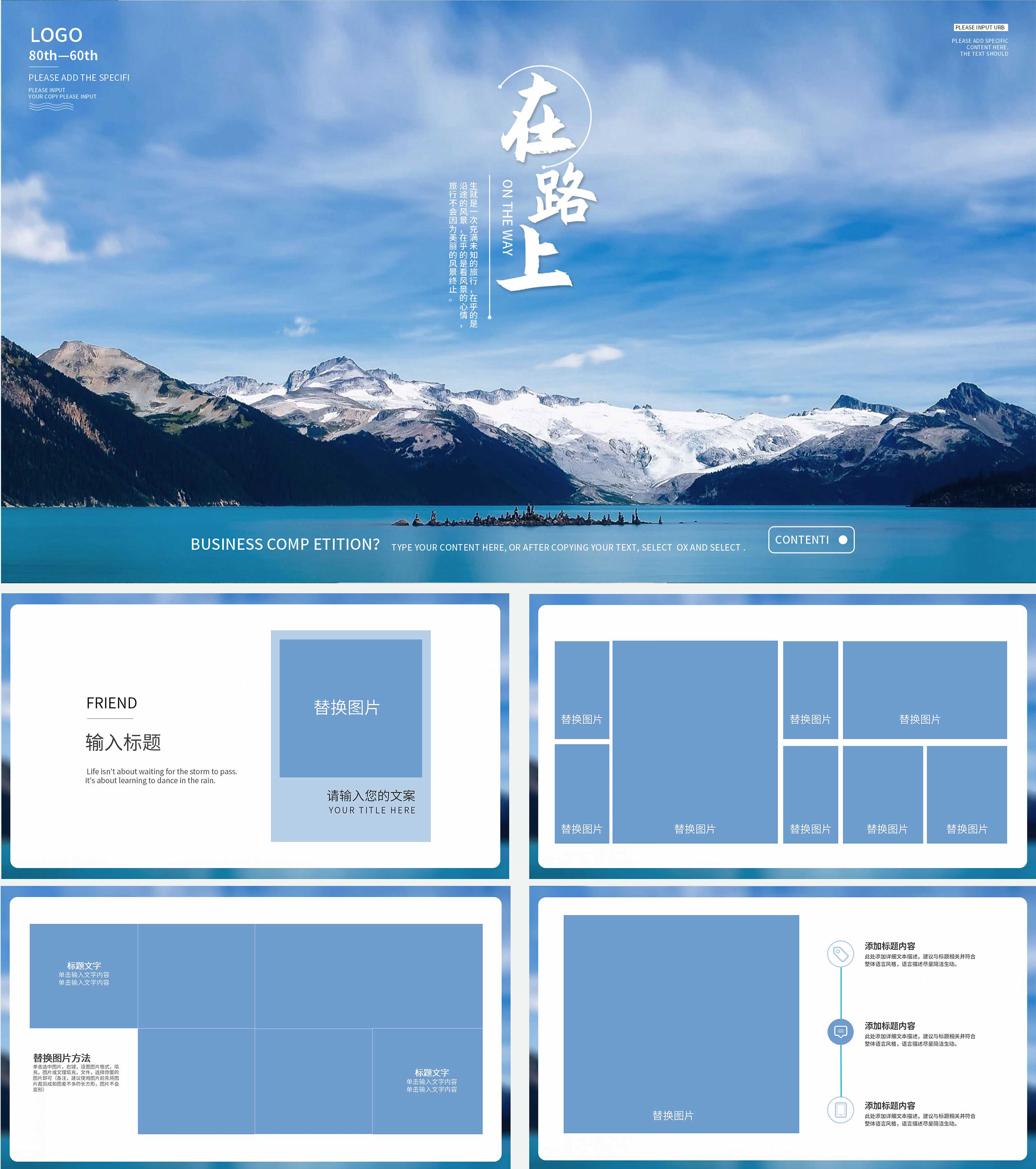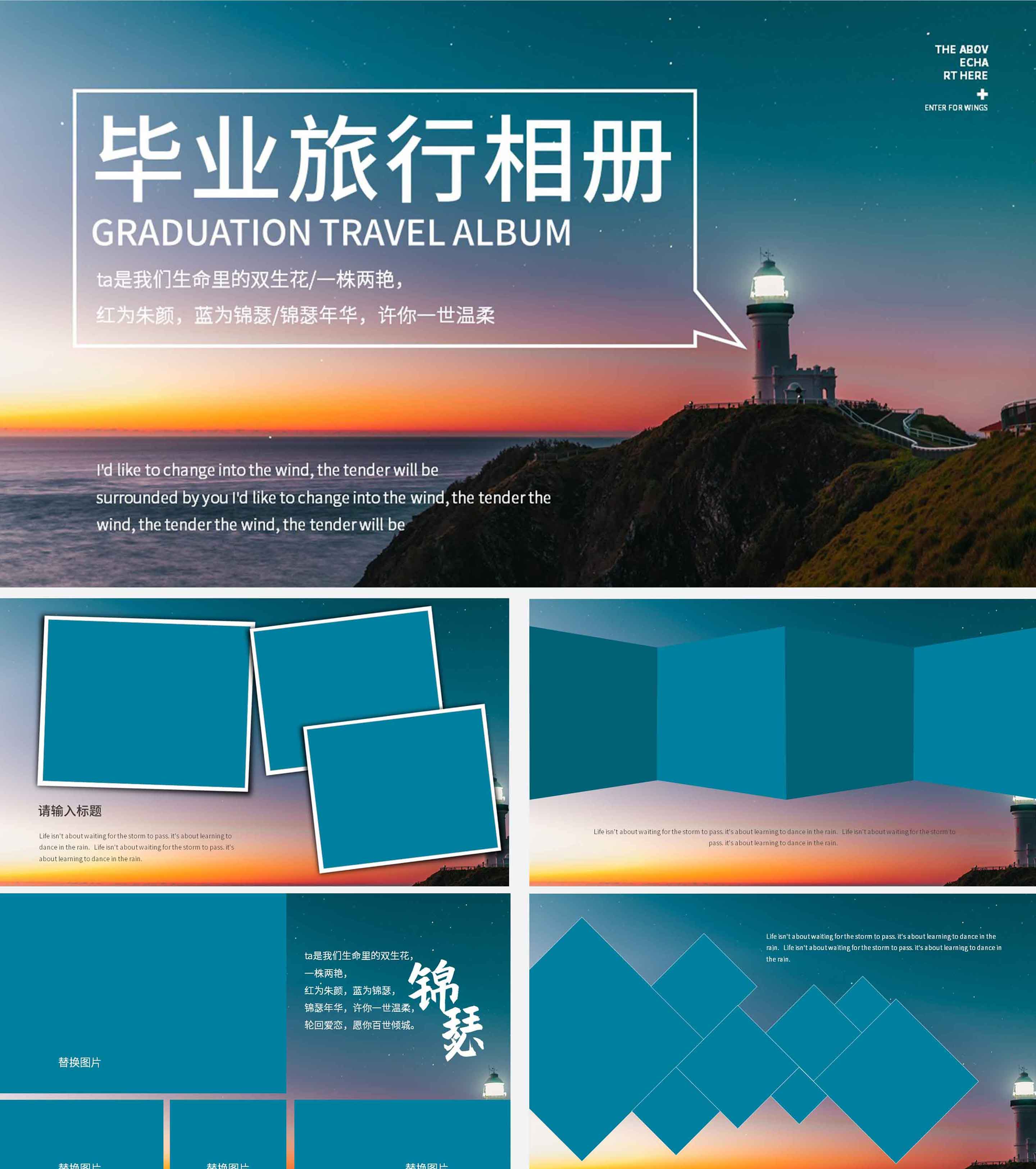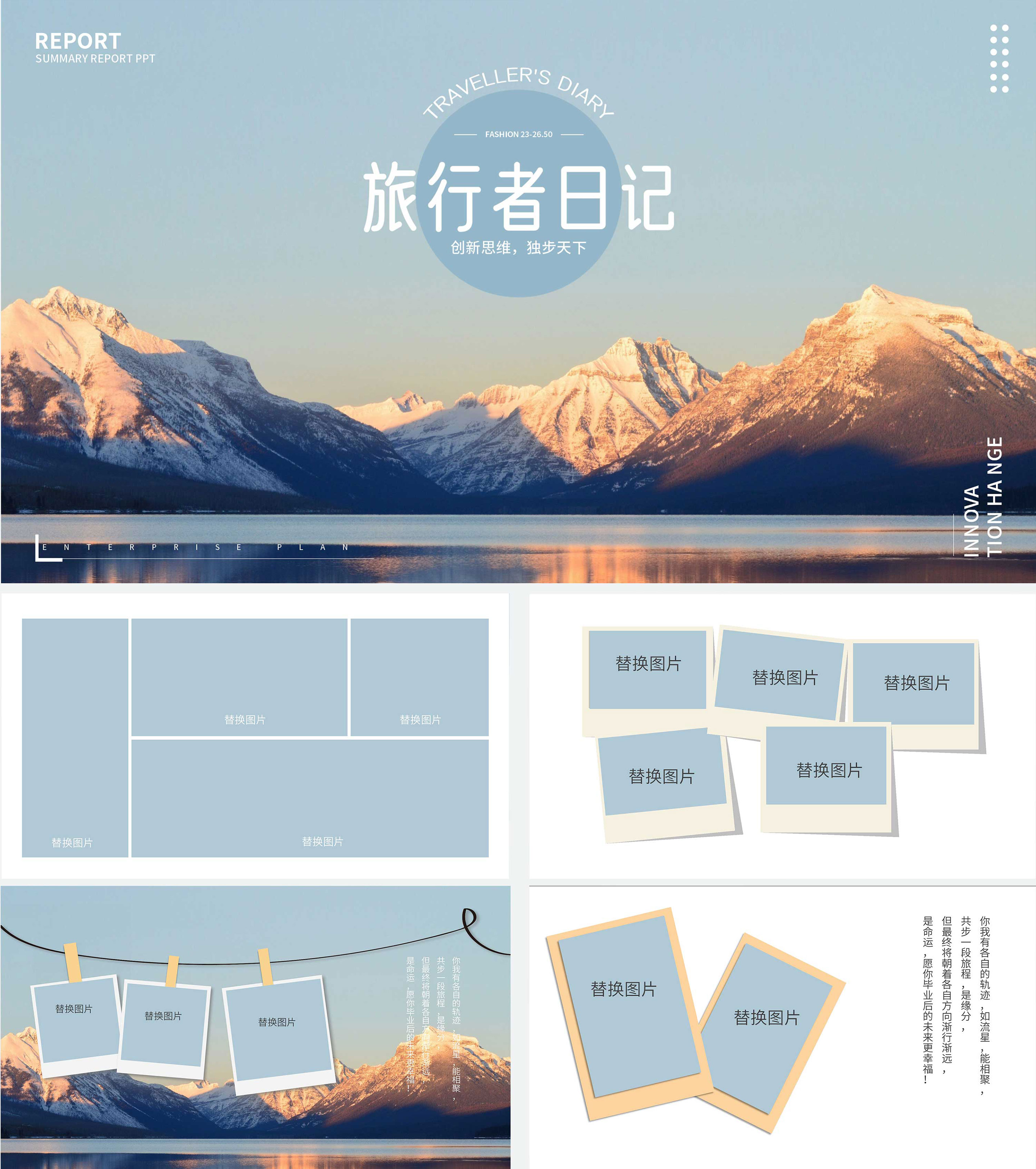 蓝色简约画册风旅行者日记旅行相册PPT模板