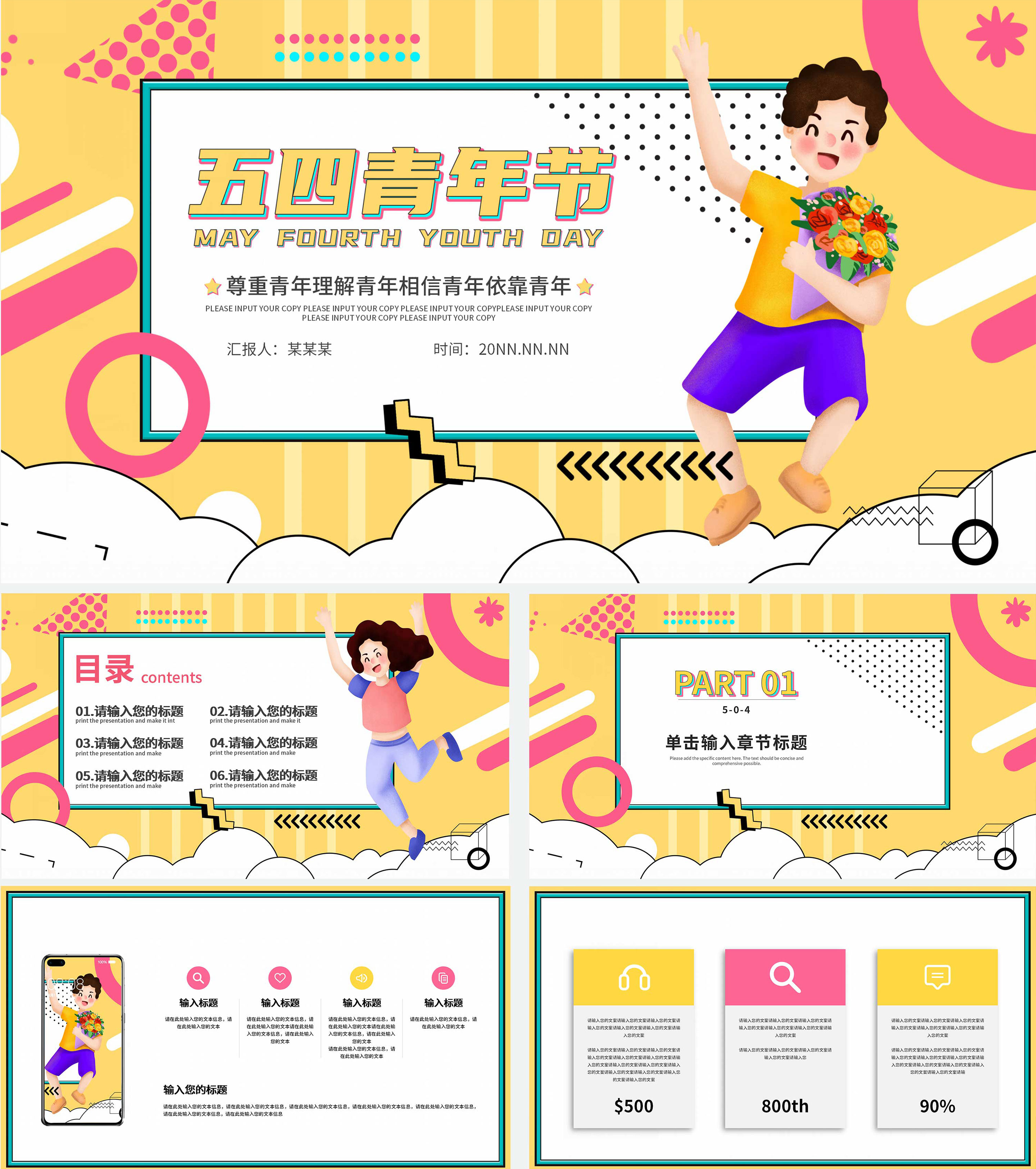 黄色卡通五四青年节PPT模板
