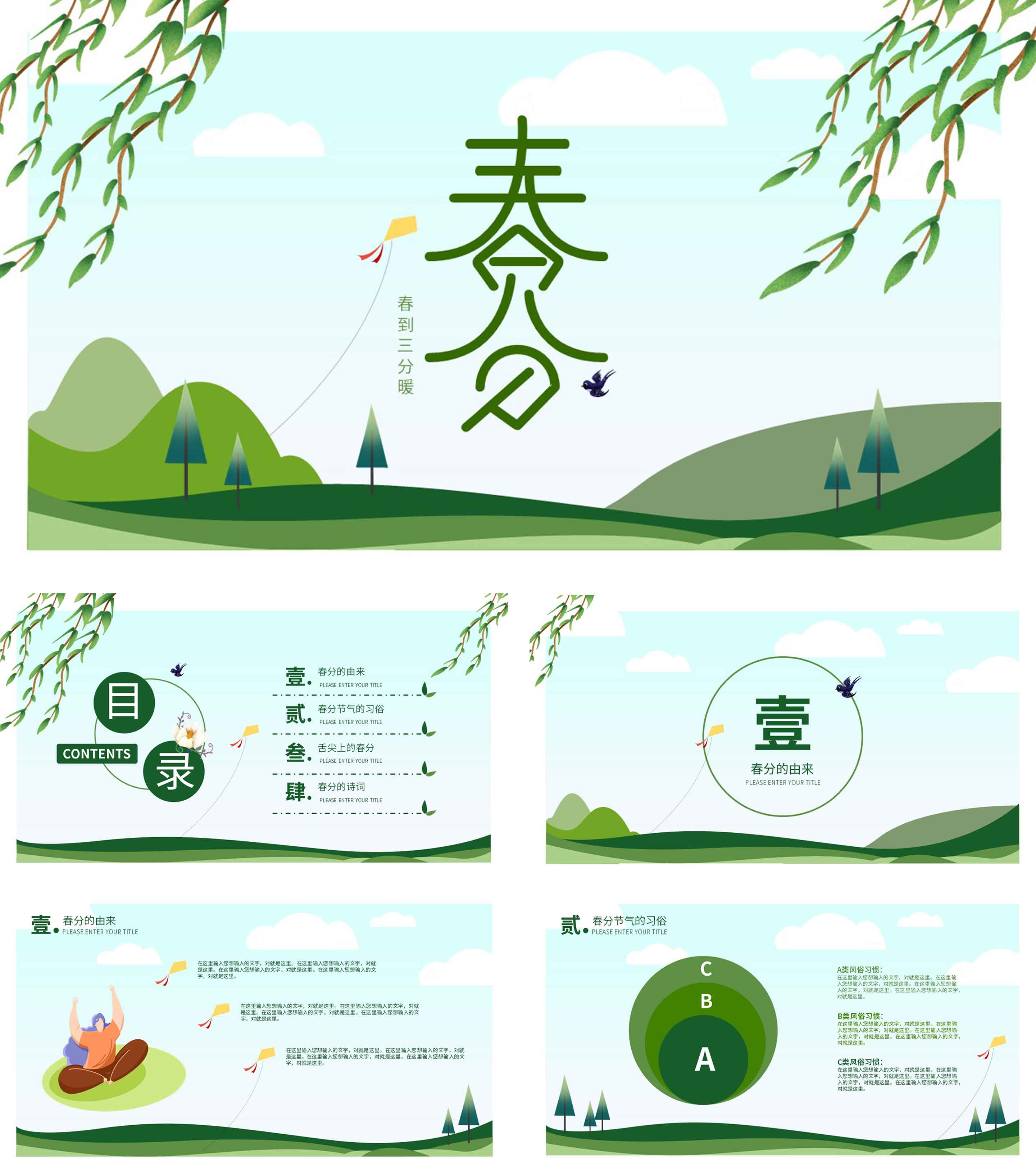 绿色卡通插画风春分节气ppt模板