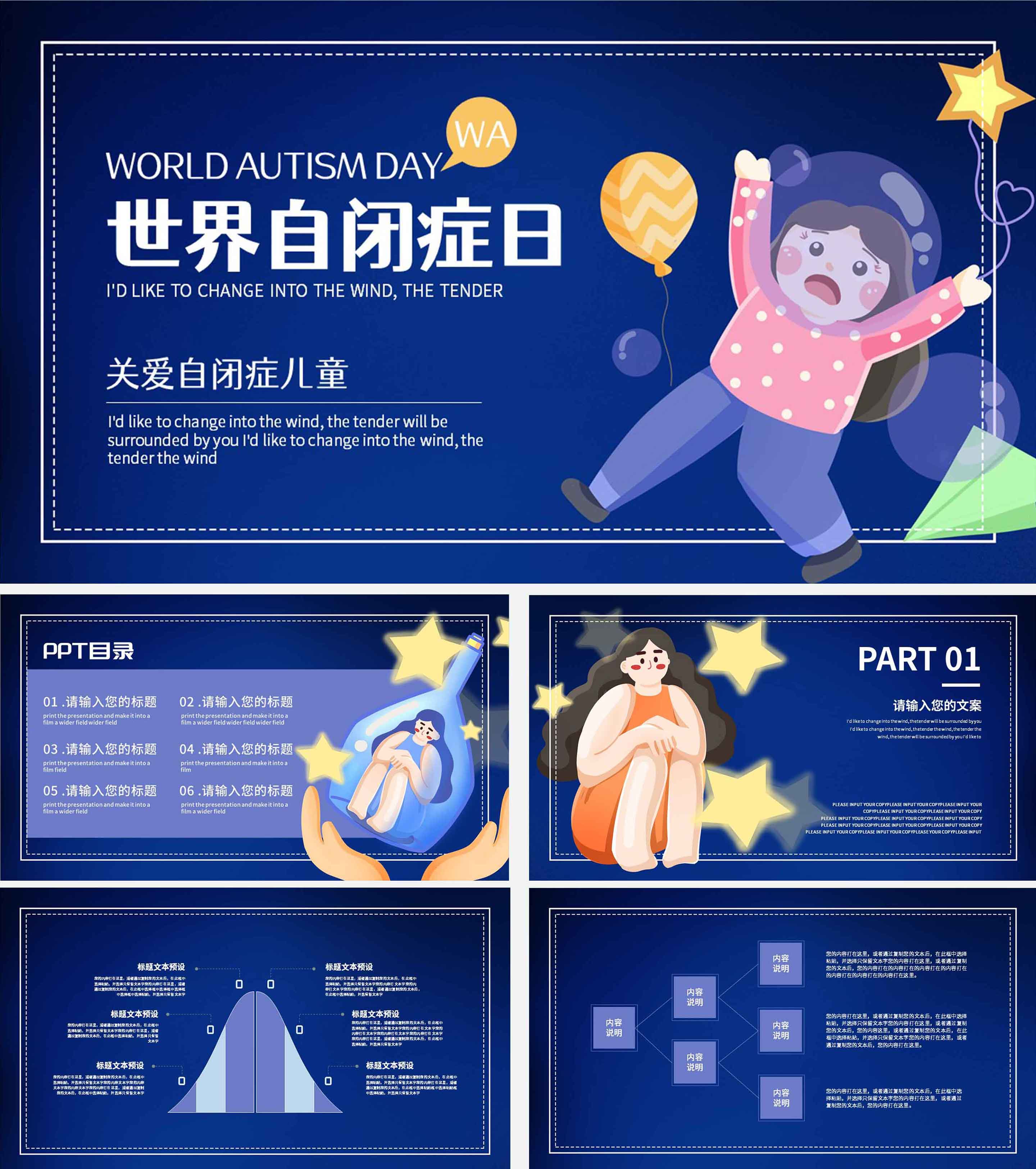 蓝色插画风女孩世界自闭症日ppt模板