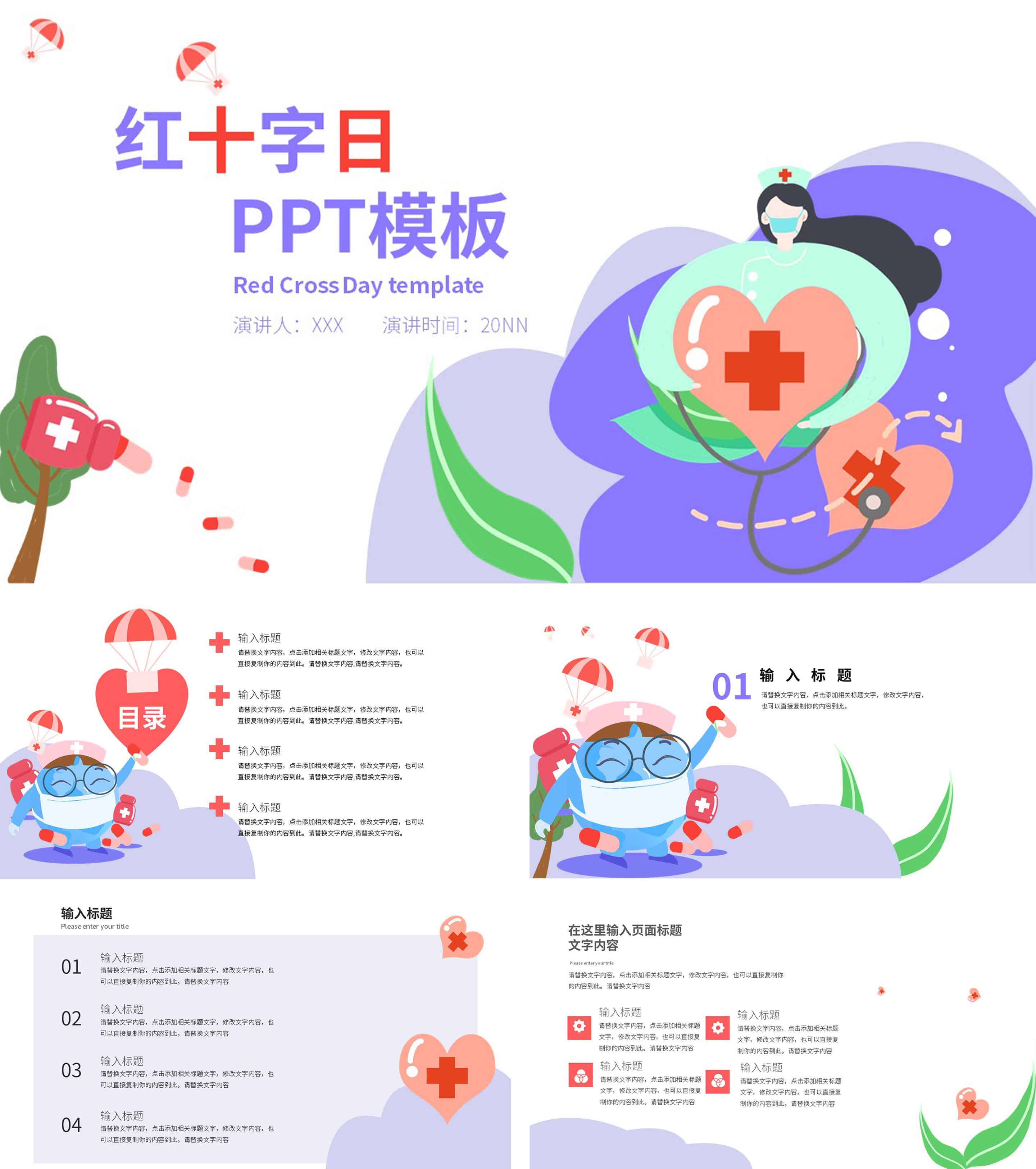 紫色卡通清新世界红十字日PPT模板