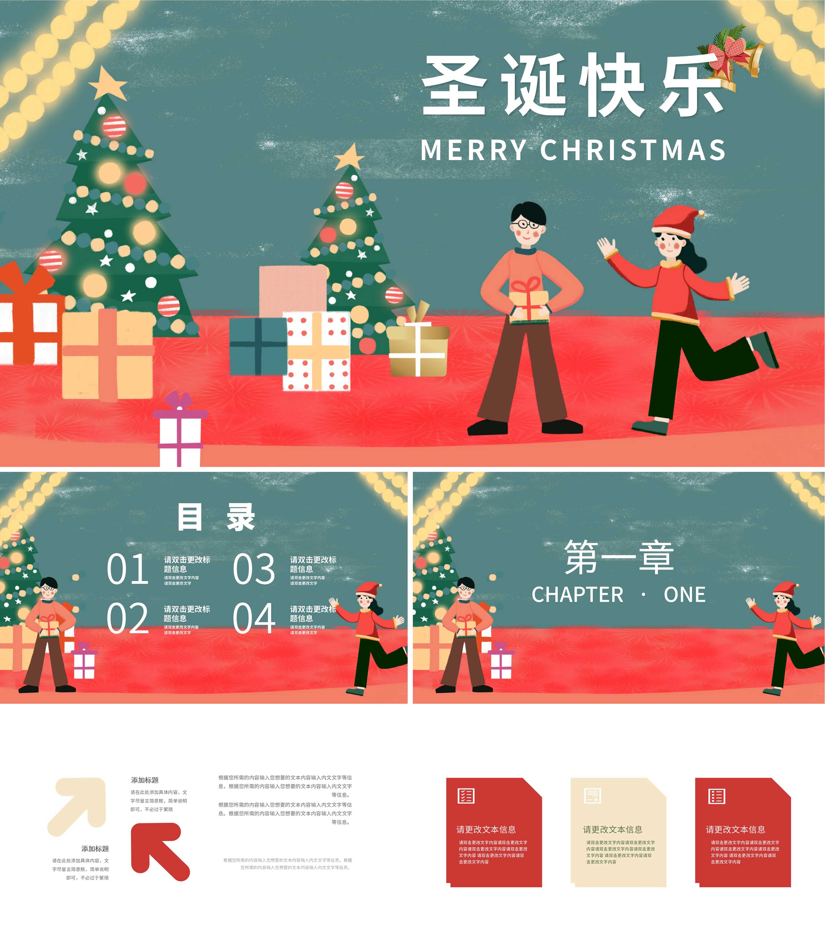 蓝色插画风情侣互送礼物圣诞节PPT模板