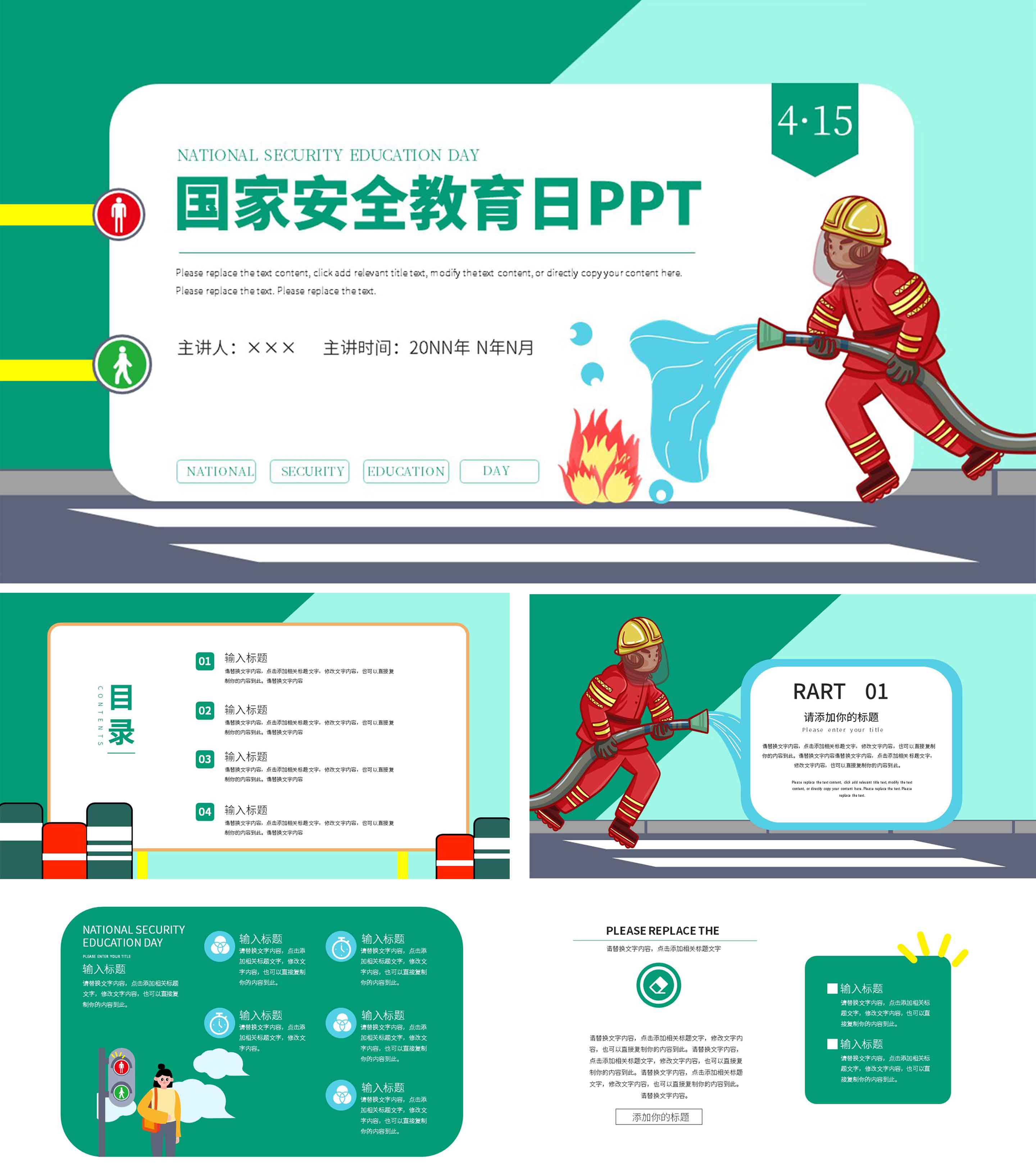 卡通风绿色消防安全教育日PPT模板