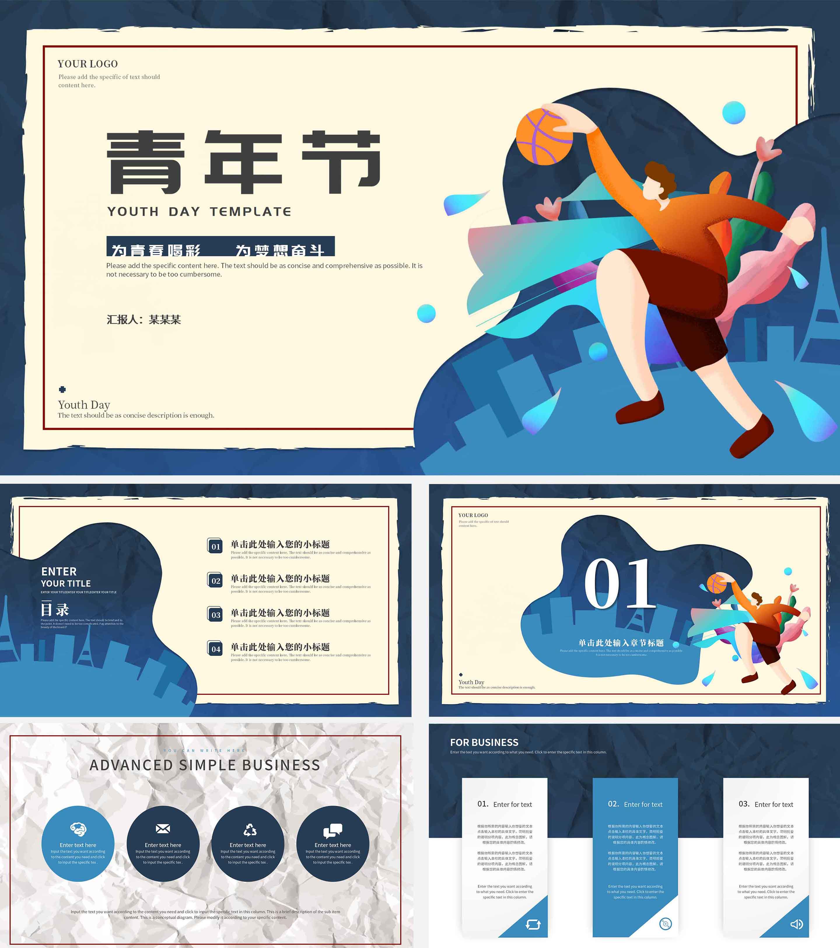 蓝色插画风五四青年节PPT模板