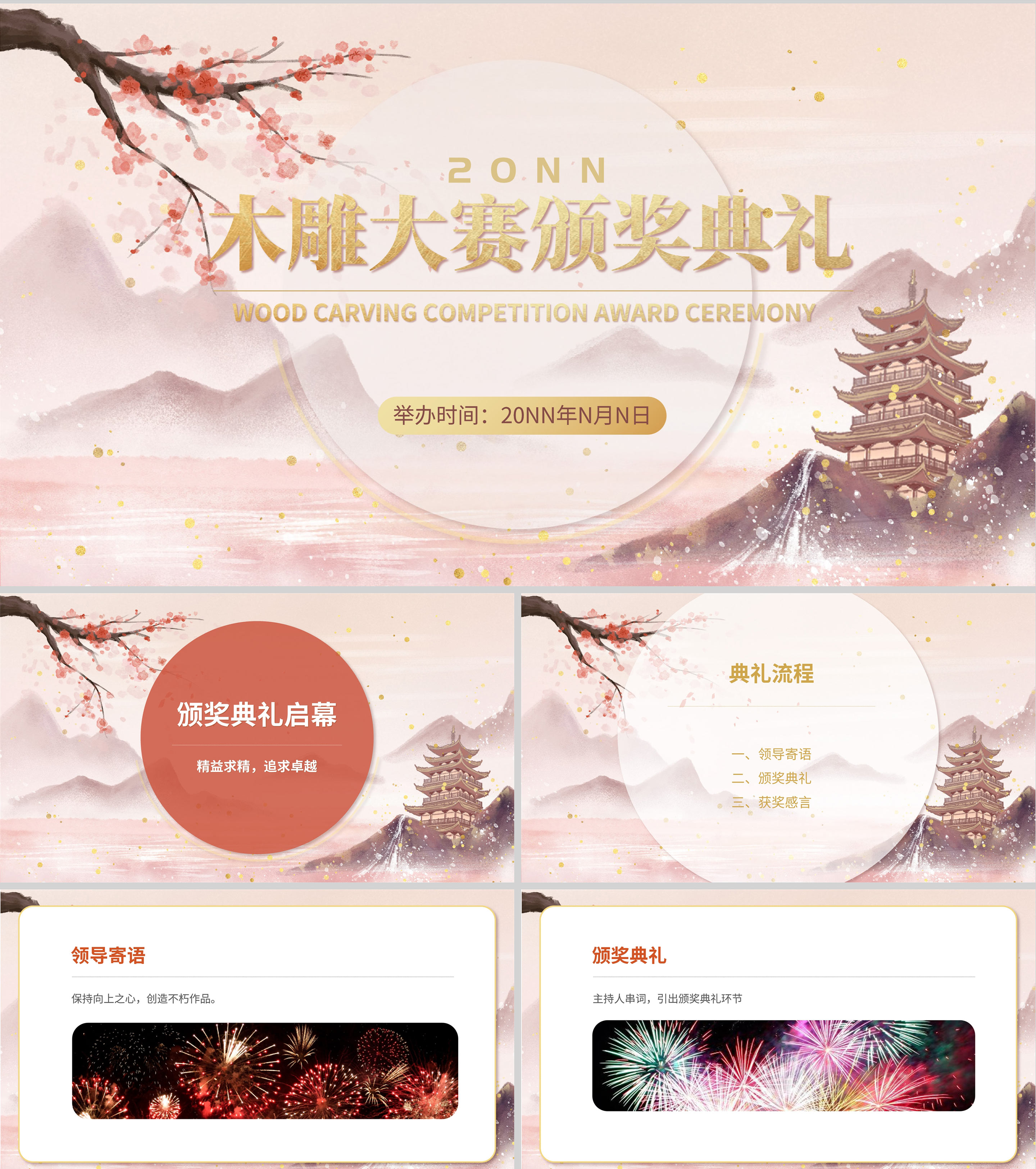 粉色水墨风传统文化木雕大赛颁奖典礼PPT模板