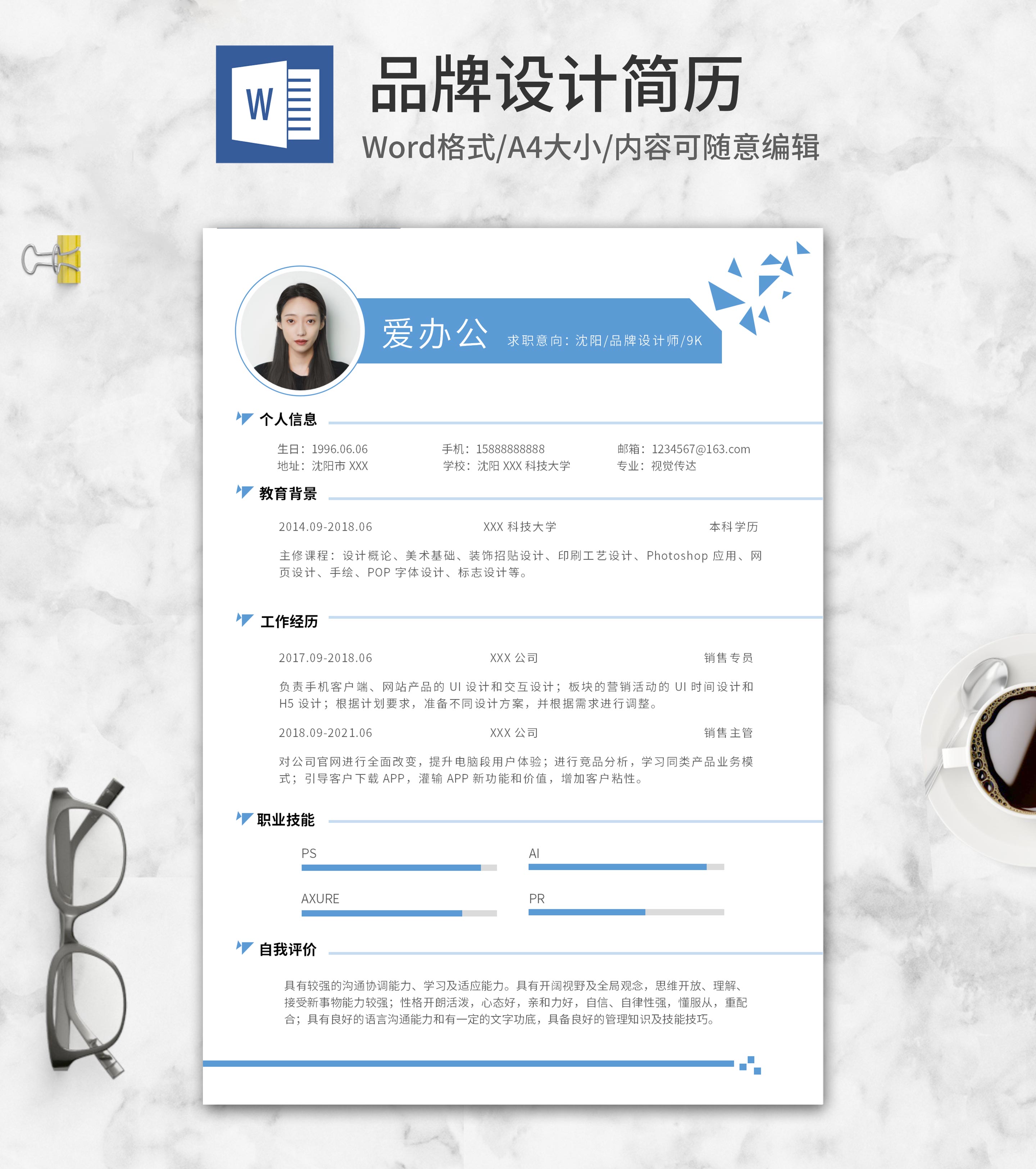 蓝色品牌设计简历word模板
