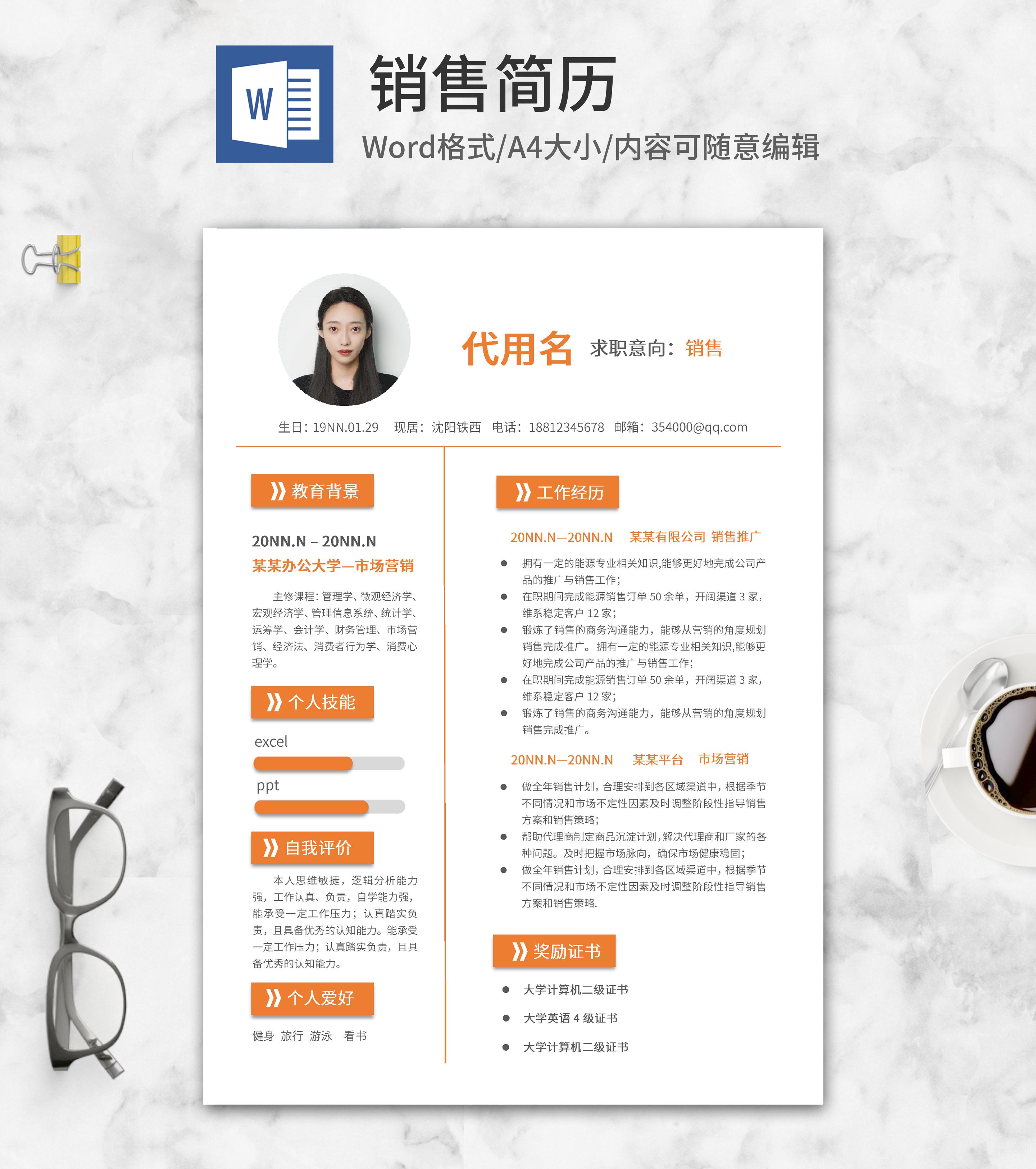 橙色求职销售简历word模板