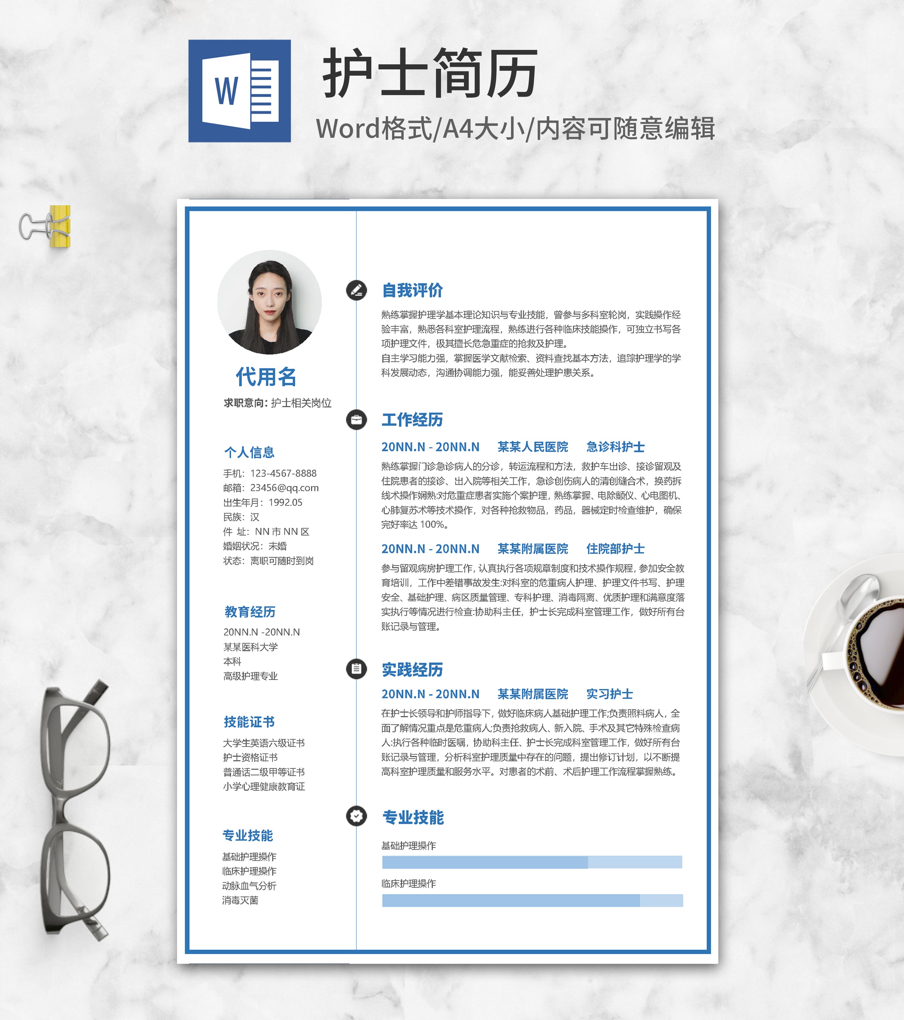 蓝色边框护士简历word模板