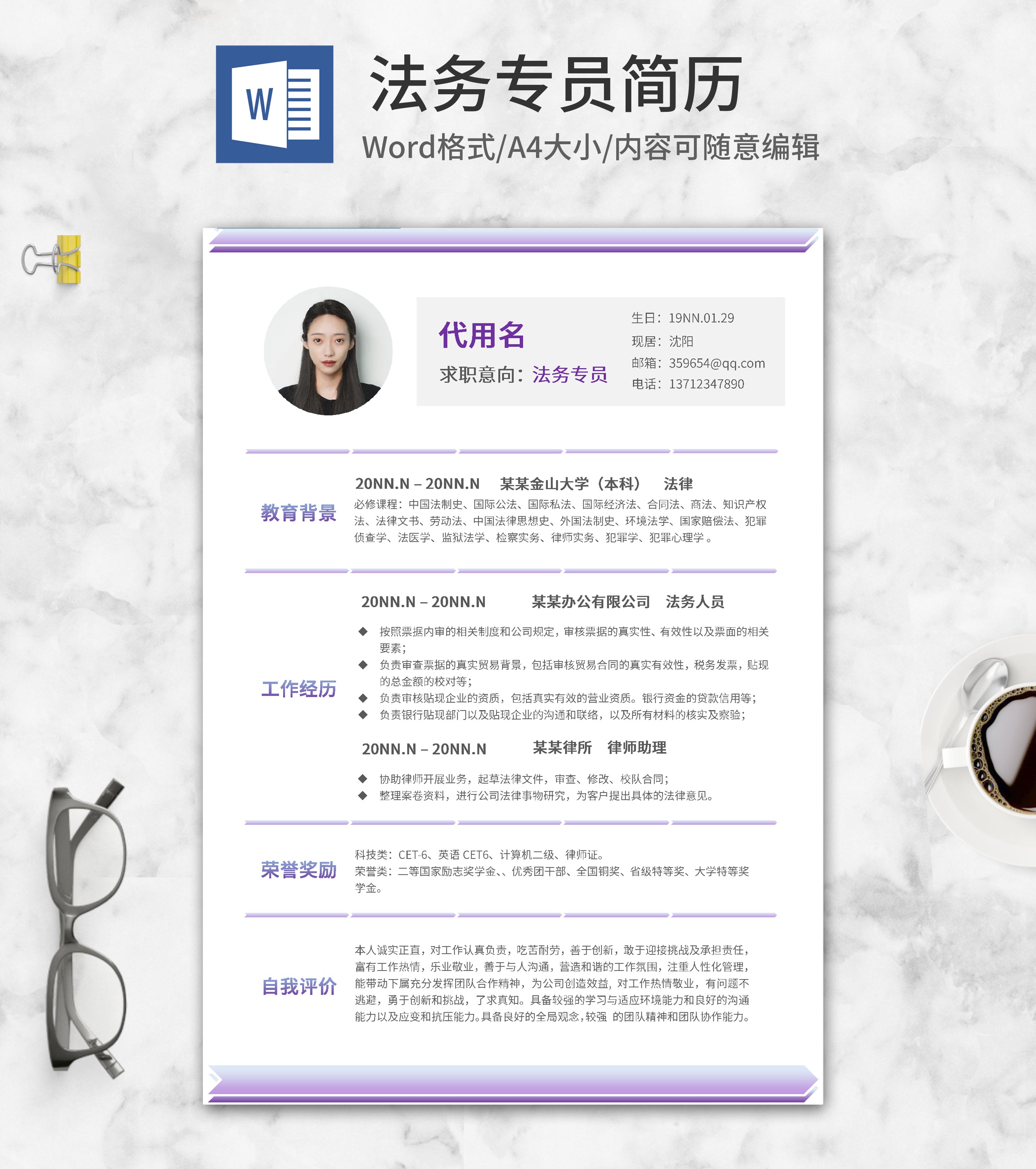 紫色渐变法务专员简历word模板