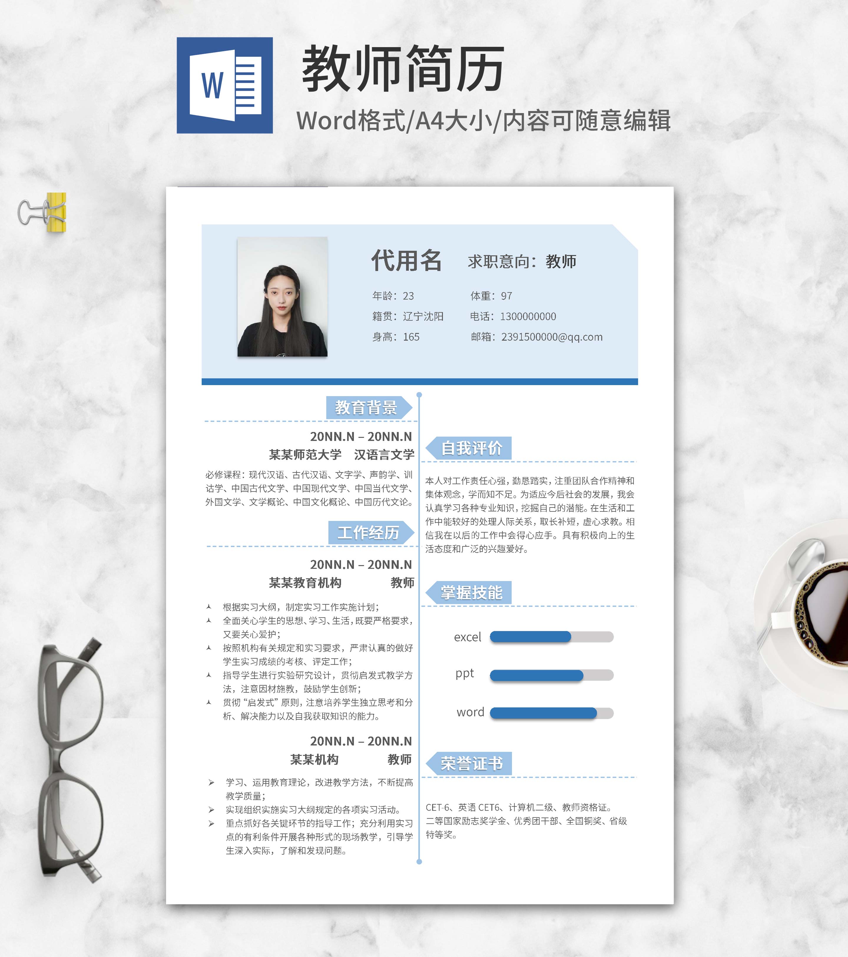 浅蓝色教师个人简历word模板