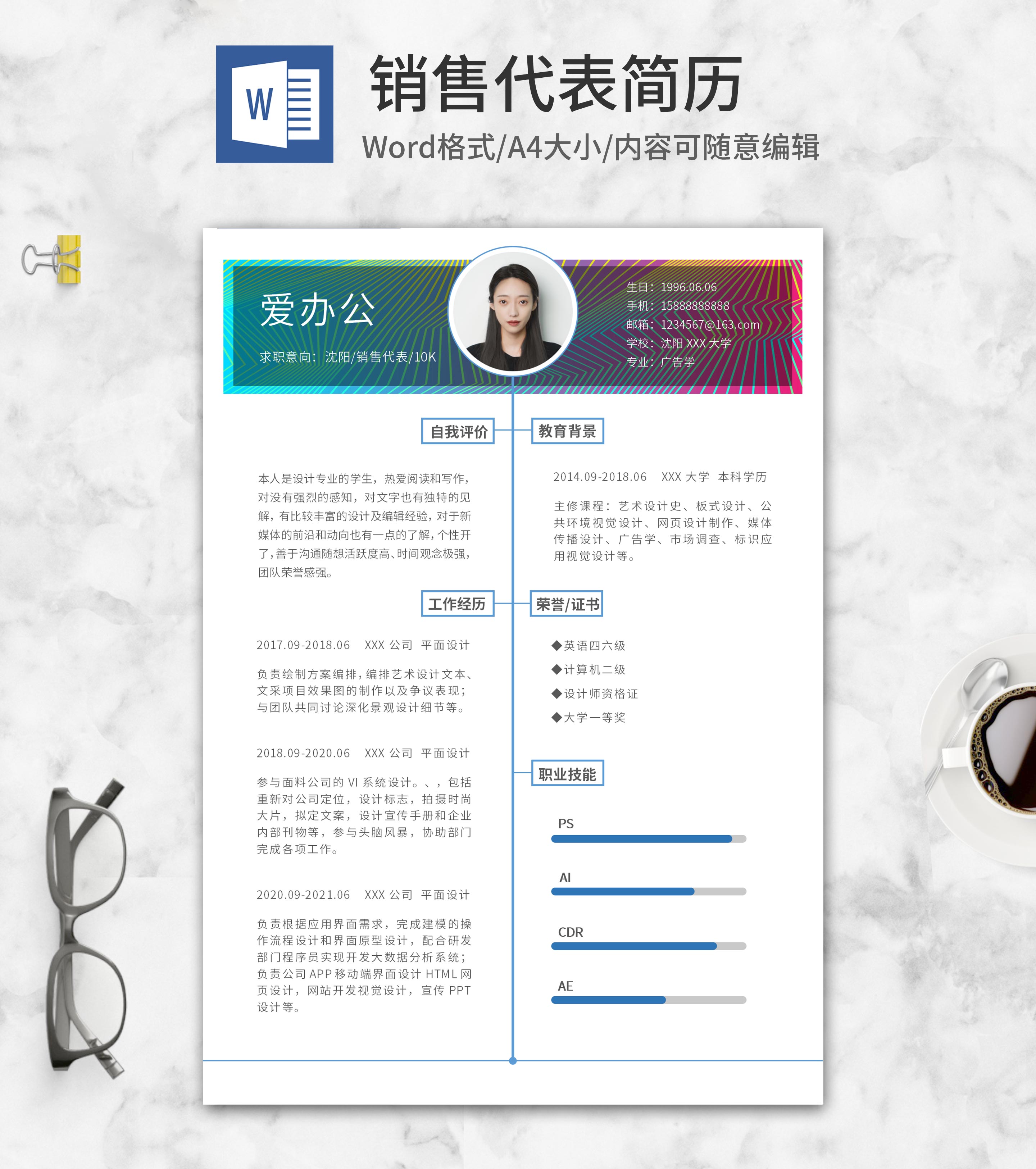 撞色线条销售代表简历word模板