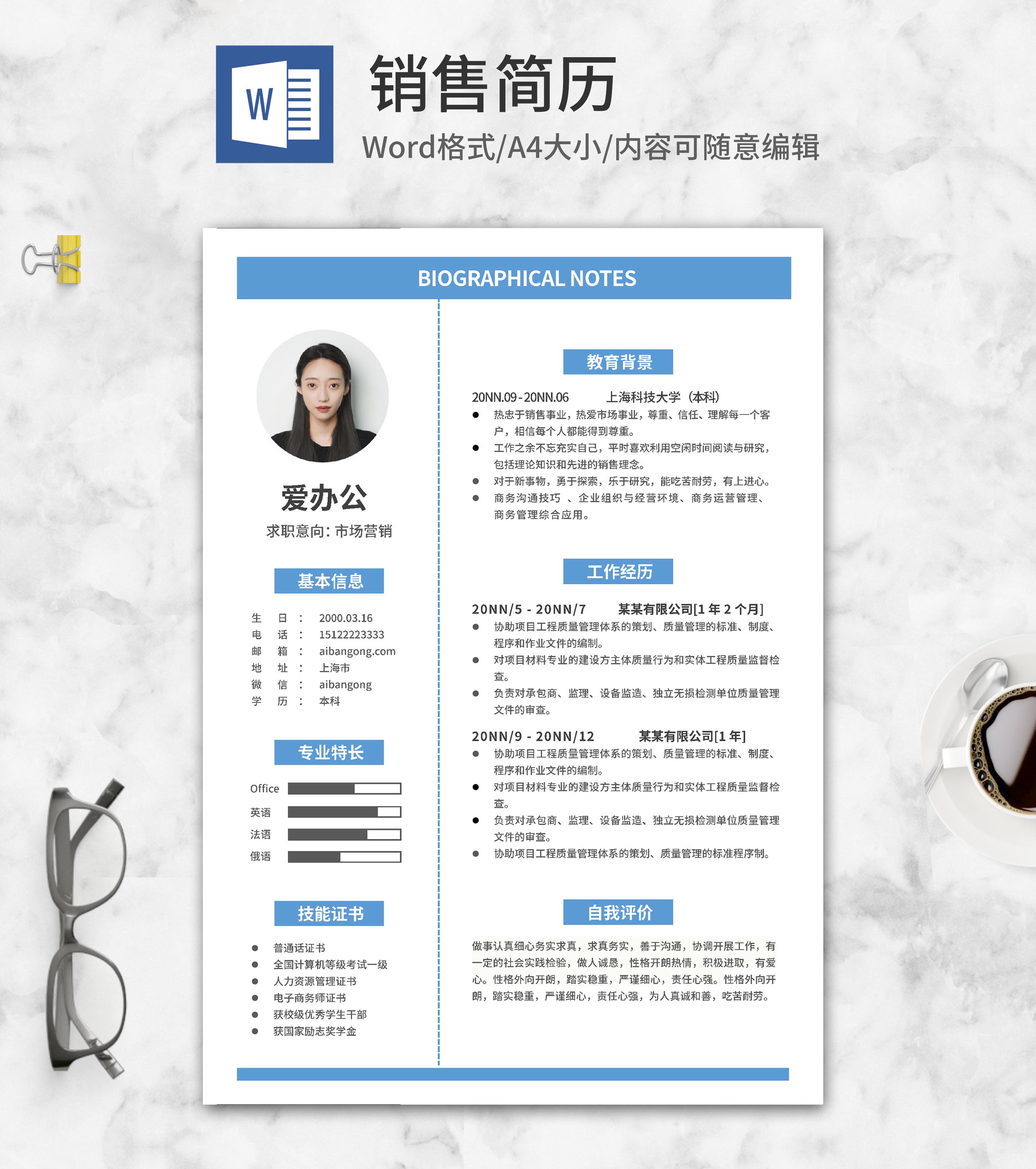 浅蓝销售个人求职简历word模板