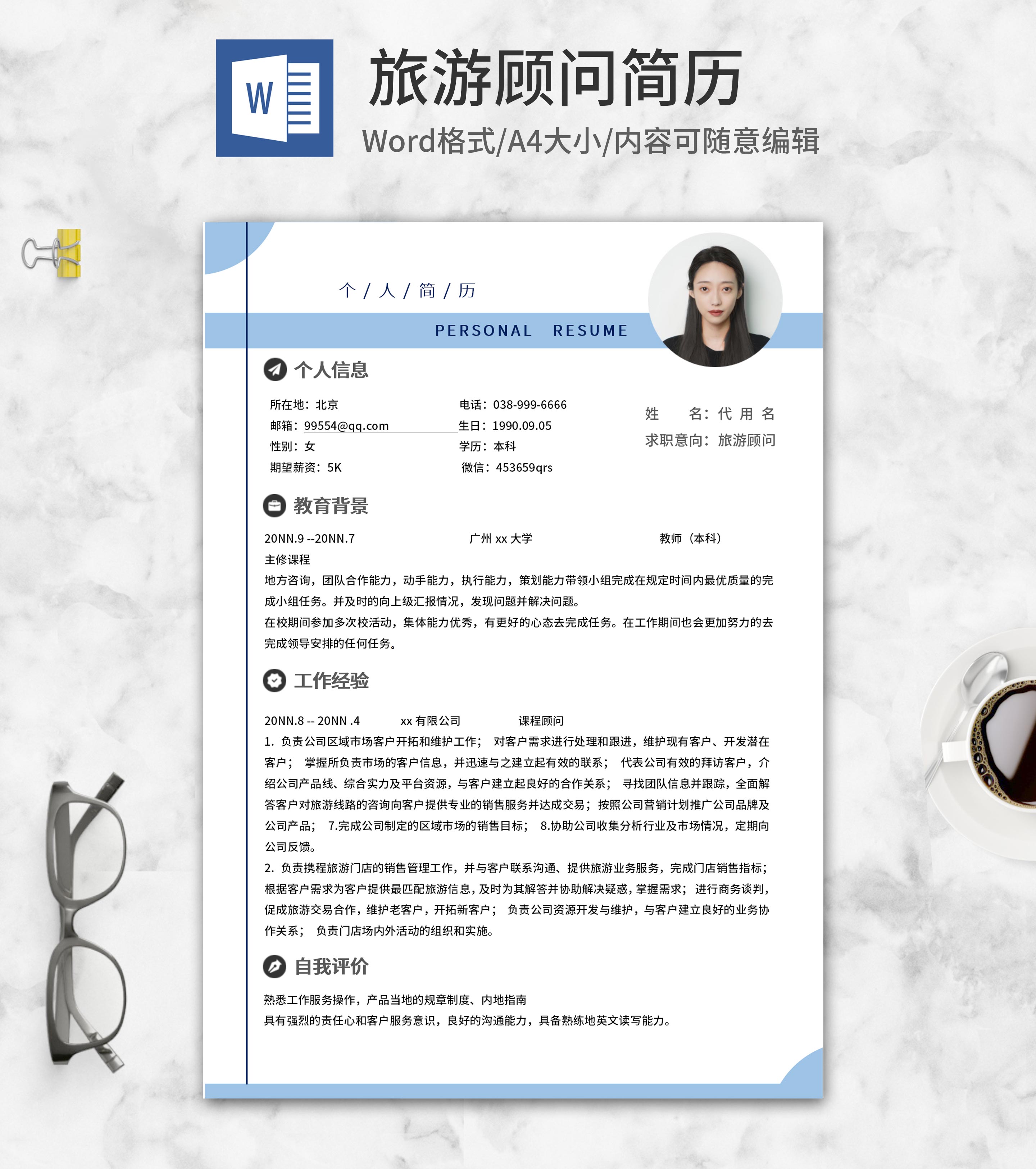 蓝色旅游顾问个人简历word模板