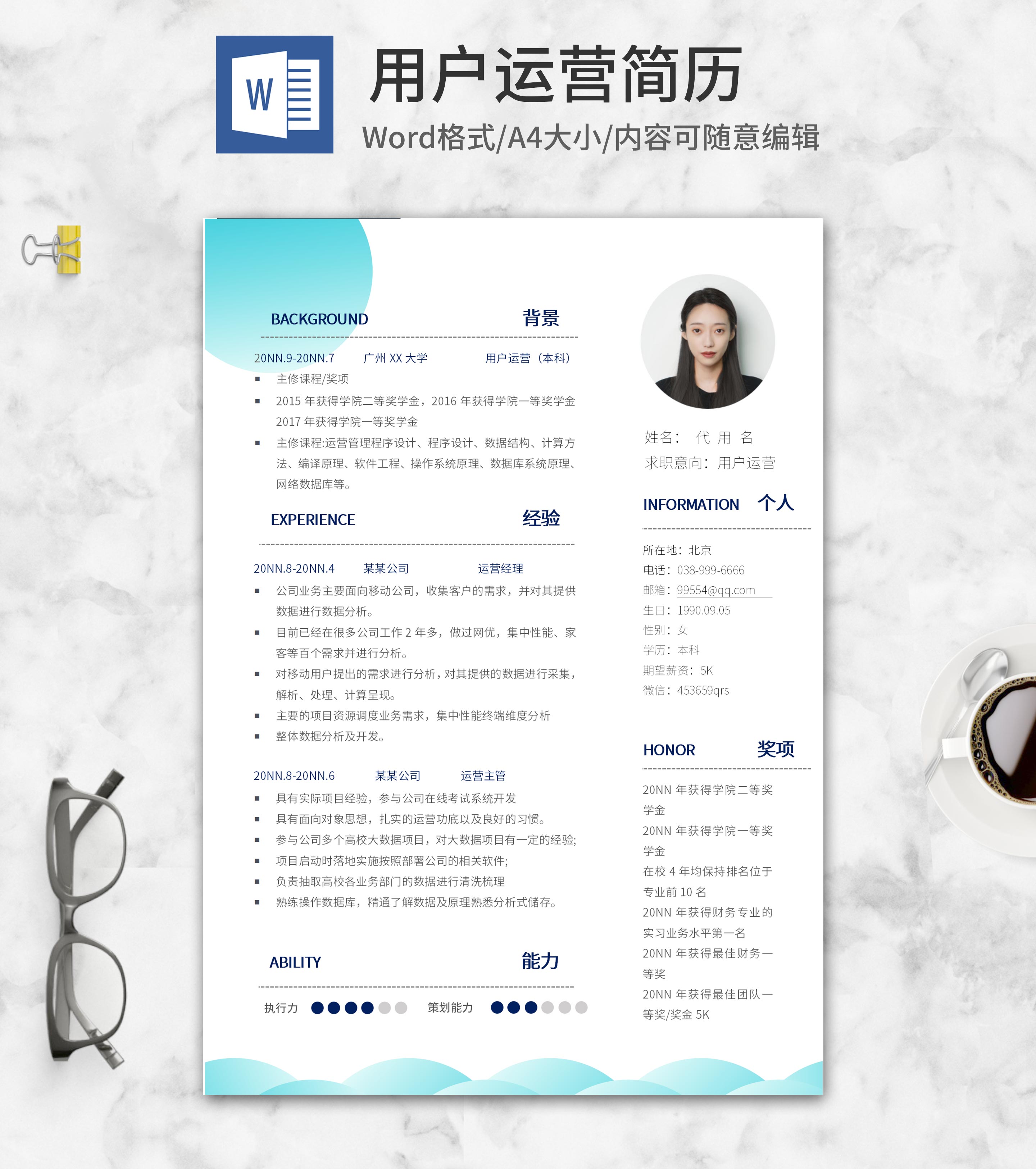 蓝色波浪用户运营简历word模板